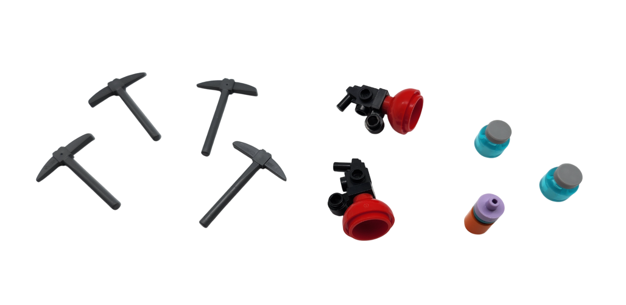 Die Protagonisten bringen natürlich alle auch einiges an Zubehör mit sich, wobei sich einiges leider auch wiederholt. Eines der wichtigsten Utensilien im Fortnite-Universum ist die Spitzhacke mit welcher sich die dringlichst benötigten Baumaterialien sammeln lassen, LEGO hat diese gleich 3x im Set verwendet. Zweimal bekommen wir die Grappler-Kanone, diese dient dazu schwer erreichbare Stellen im Spiel zu erreichen aber auch Gegner können alternativ damit herbeigezogen werden. Auch der bekannte Slurp Juice, mit welchem sich die Schild neu aufladen können, ist 2x enthalten. Last but not least ist noch eine Flasche Slap Juice am Start, diese gibt 15 Lebenspunkte zurück und 40 Sekunden unbegrenzte Energie.