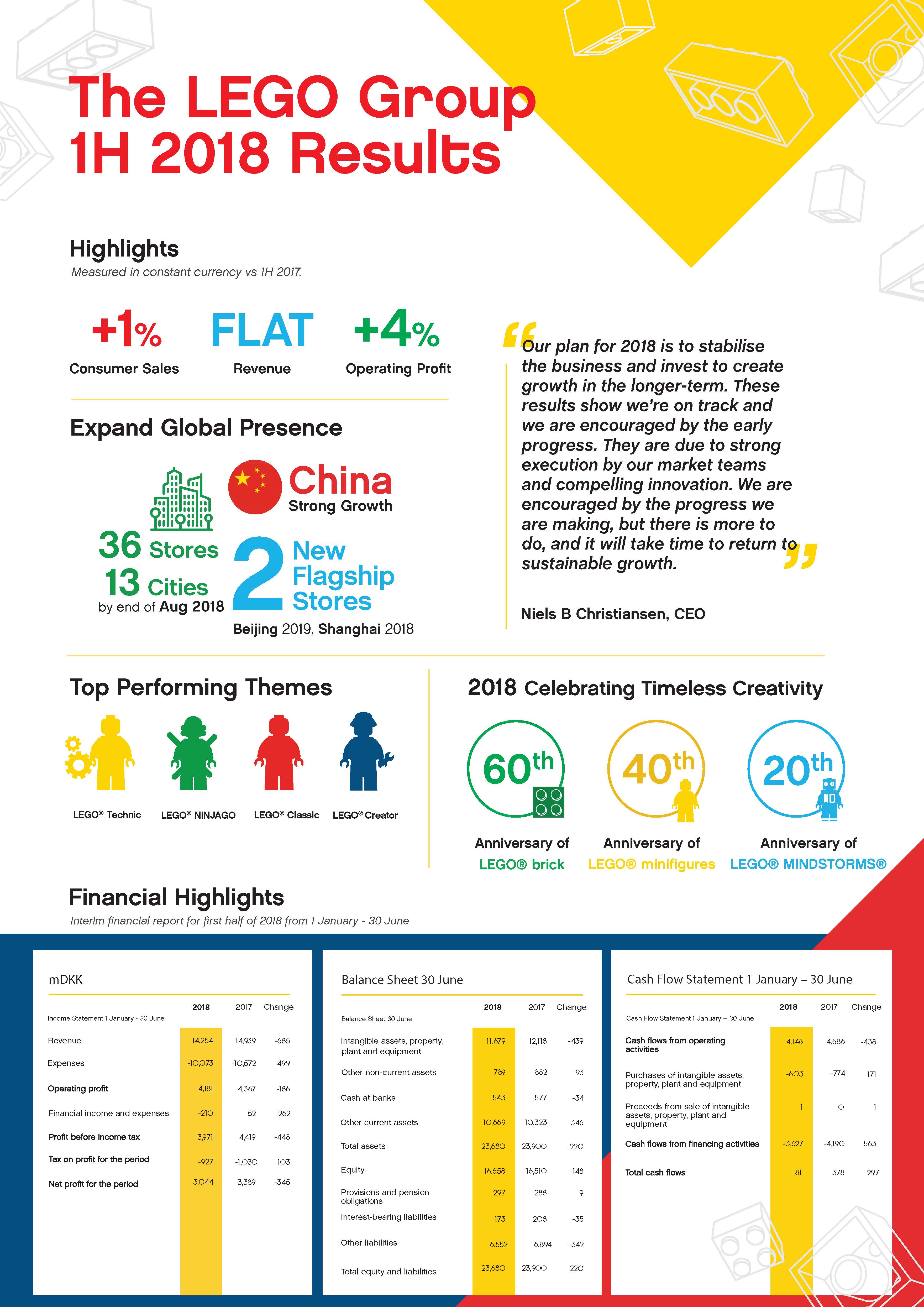 Der operative Gewinn belief sich auf 4,2 Milliarden Dänische Kronen, verglichen mit 4,4 Milliarden Dänischen Kronen im Jahr2017 – dies entspricht einem Rückgang von vier Prozent. Ursache für den Rückgang war der schwächere US-Dollar. Die LEGO Gruppe arbeitet weiterhin am Aufbau eines starken Fundaments für nachhaltiges Wachstum und investiert Einsparungen aus Umstrukturierungen in Produkt- und Erlebnisinnovation und den Ausbau von Channels. Die LEGO Gruppe expandiert zudem weiterhin in strategischen Märkten und wird innerhalb des nächsten Jahres zwei neue Flagship-Stores in China eröffnen: einen in Shanghai im September 2018 und einen zweiten in Peking Anfang 2019. Auch die Partnerschaft mit Tencent, einem der größten Internetunternehmen Chinas, soll weiter ausgebaut werden. Nach der erfolgreichen Einführung des Videokanals im Mai ist für die zweite Hälfte 2018 ein Spiel geplant.