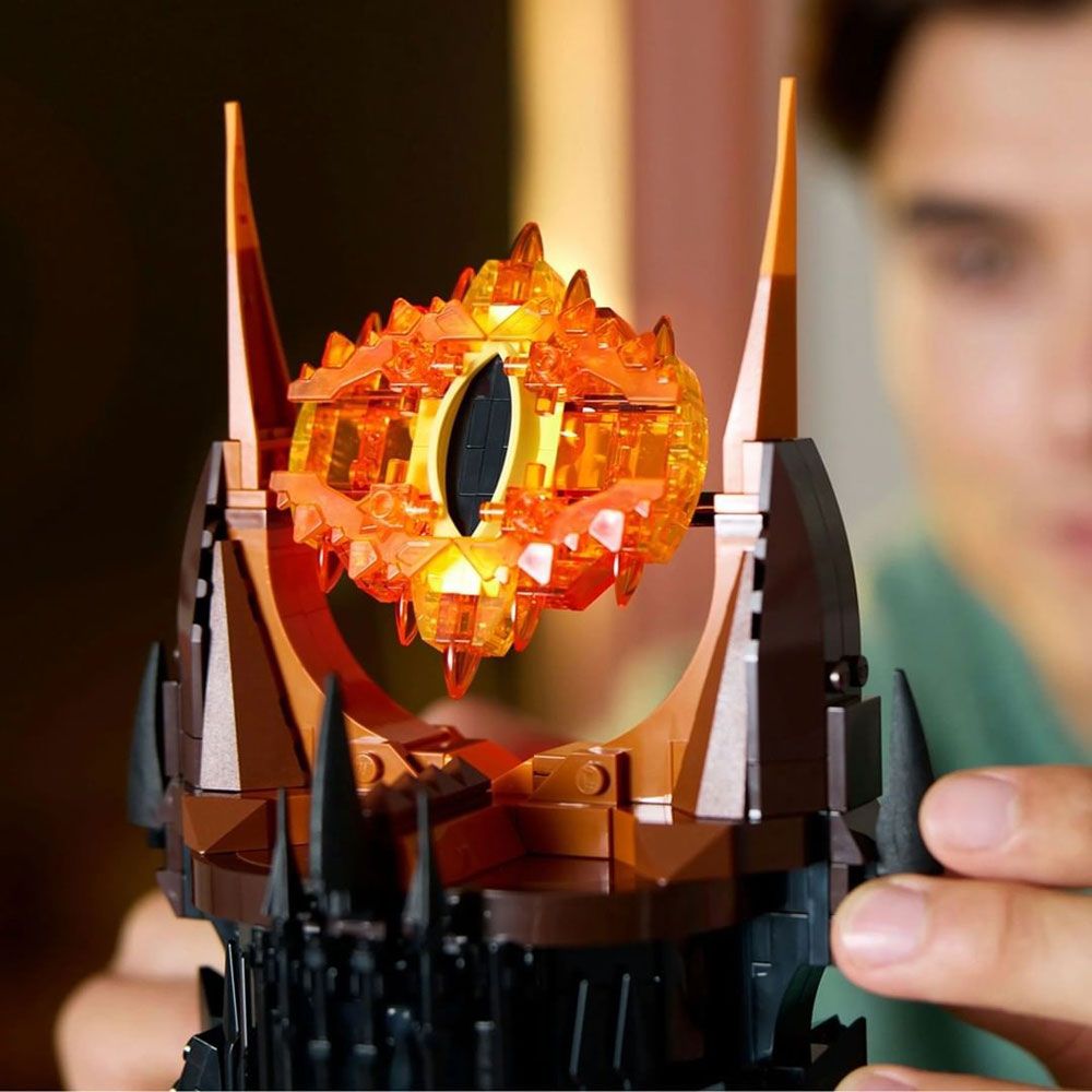 Vom hoch emporragenden Turm der unheilvollen Festung schaut Saurons Auge auf Mittelerde hinab. 10 Minifiguren, darunter auch Sauron, Saurons Mund, Gothmog, ein Ork, Frodo, Sam und Gollum, vervollständigen das Set.