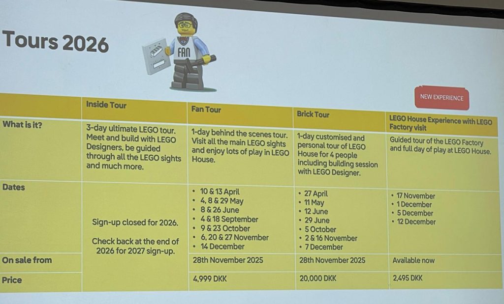 Zum Schluss der Präsentation gab es noch eine Übersicht der anstehenden Termine für Fans im LEGO House. Neben der LEGO Inside Tour gibt es noch Fan- und Brick-Touren sowie eine geführte LEGO House Tour mit anschließendem Besuch der LEGO Fabrik in Billund.
