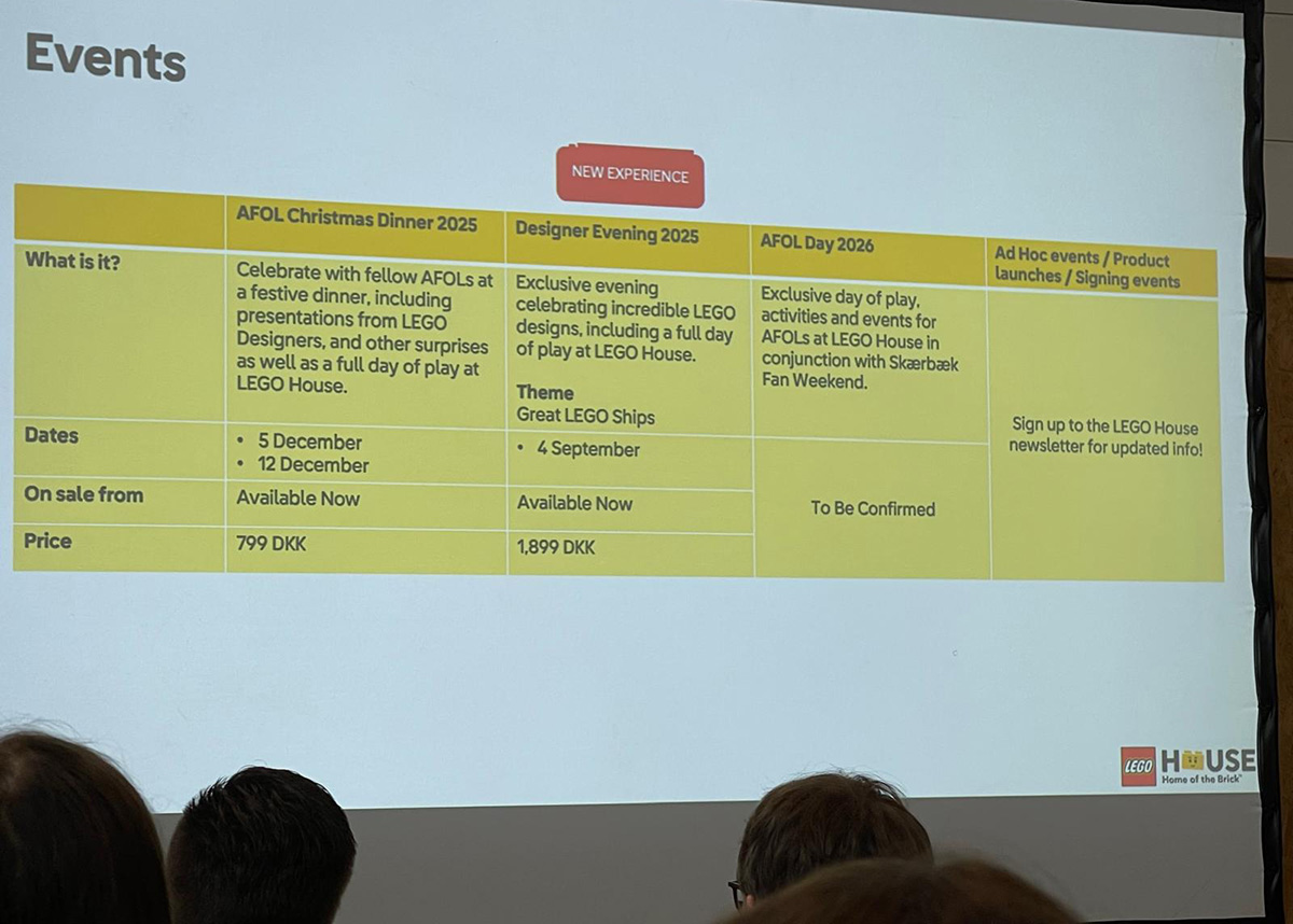 Zum Schluss der Präsentation gab es noch eine Übersicht der anstehenden Termine für Fans im LEGO House. Neben der LEGO Inside Tour gibt es noch Fan- und Brick-Touren sowie eine geführte LEGO House Tour mit anschließendem Besuch der LEGO Fabrik in Billund.
