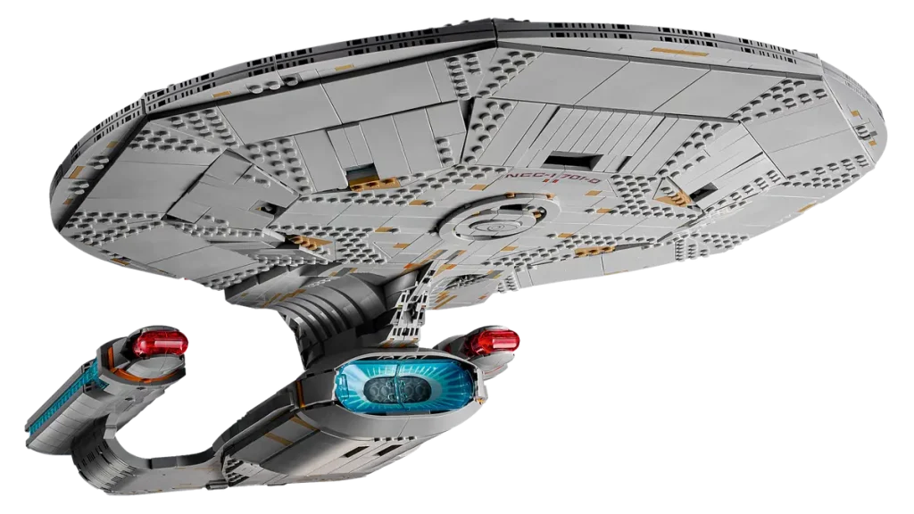 Die U.S.S. Enterprise-D ist bekannt aus der Star Trek: The Next Generation Serie, welche Ende der 80er Jahre erstmals über die Bildschirme flimmerte, hatte aber auch Auftritte in Filmen wie Generations oder dem Star Trek: Picard Spin-Off. Die Umsetzung von LEGO besteht, so gibt es die Realvorlage her, zu einem großen Teil aus Steinen in der Farbe grau. Akzente werden hier vor allem im Bereich der beiden Warp-Gondeln gesetzt die mithilfe von zahlreichen Teilen in trans-blue und rot umgesetzt wurden. Der obere Teil des Schiffes die sogenannte Kommando-Untertasse kann vom restlichen Rumpf abgetrennt werden. Der Shuttleship Hangar ist dabei ausklappbar , wobei zwei Mini-Shuttlepods Platz darin finden. Mini ist dabei aber auch das Stichwort.