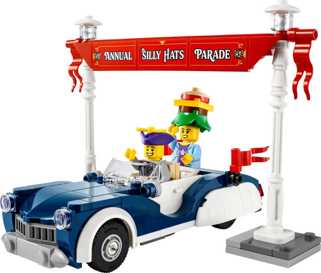 Auf alle Käufer des neuen Modular Buildings wartet noch eine exklusive Gratisbeigabe, die LEGO Icons 40913 Oldtimer-Parade. Das Set besteht aus einem dunkelblauen Oldtimer, welcher durch ein Banner mit der übersetzten Aufschrift „Parade der dämlichen Hüte“ fährt. Demzufolge verfüge beide enthaltenen Minifiguren auch über kuriose Kopfbedeckungen wie einen Burger und einen Piratenhut samt Propeller. Das Set besteht aus 243 Teilen und ist bereits im LEGO Onlineshop gelistet.