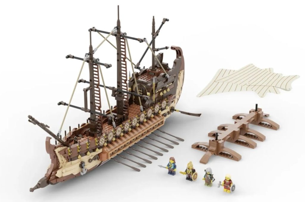 Das Antike Schiffe mit vier kriegerischen Helden ist in einem klassischen Braun gehalten. Auf der Bugseite befindet sich ein hervorstehender Teil, der sich kräftig durch das Wasser vorwärts bewegen kann. Sowohl der Bug als auch die Bauchspitze weisen große geschwungene Bögen auf. In der Mitte des Schiffes befinden sich mehrere bewegliche Ruder. Beide Seiten des Schiffes haben Anker und Heckruder. Drei beige-braune Segel an Masten mit Leitern ermöglichen die Fahrt. In der Mitte des Decks befindet sich ein Eingang zum Schiff. Am Ende des Schiffsdecks befindet sich die Kabine. Das Innere kann durch Abtrennen der Kabinendecke oder der gesamten Kabine entdeckt werden. Unter dem Schiff befindet sich ein großer Sockel, der das Schiff trägt, aber abgetrennt werden kann.