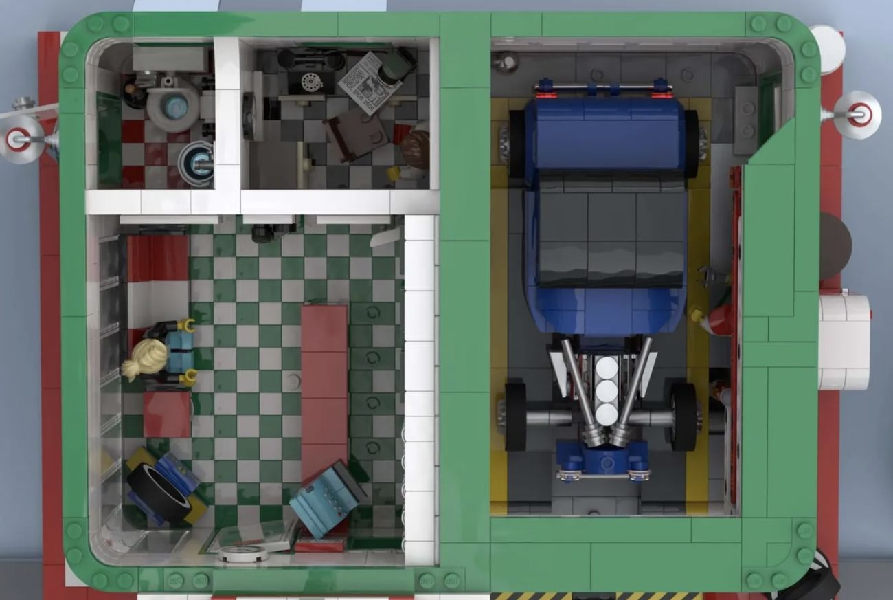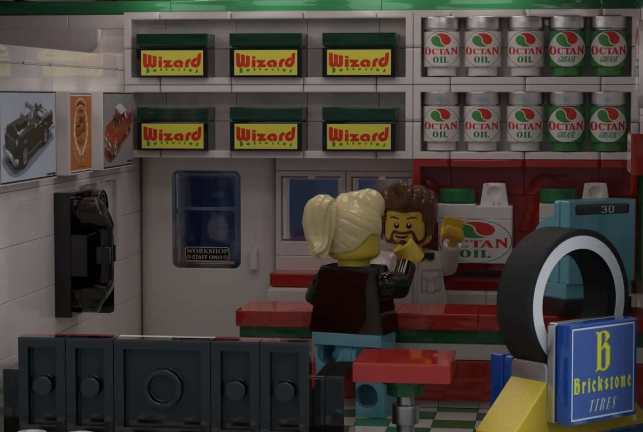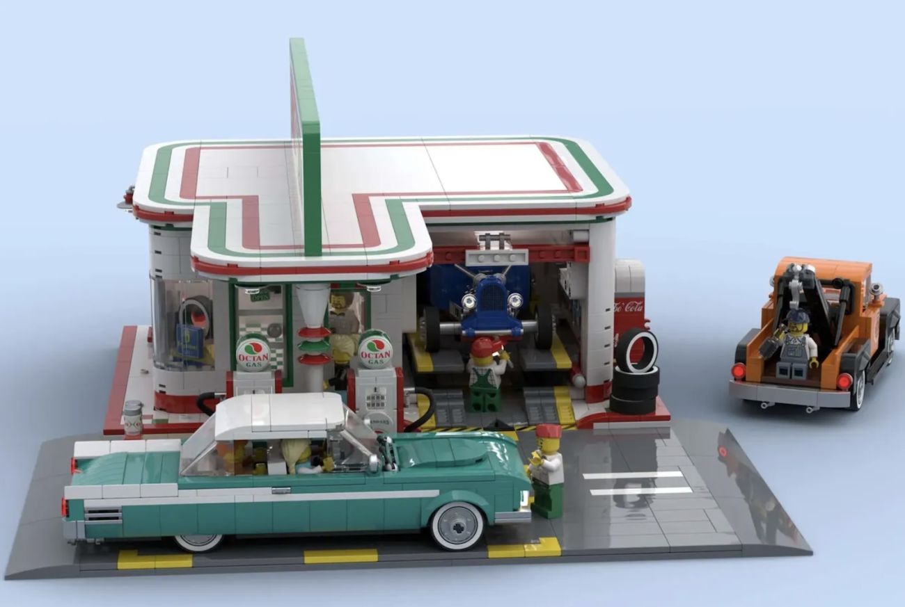 Die Vintage-Tankstelle wurde maßstabsgetreu entworfen, sodass die neuen 8-Noppen-breiten Fahrzeuge, die Anfang 2020 von LEGO eingeführt worden sind, in das Gebäude hineinfahren können. Die Servicestation verfügt über eine Familienlimousine, einen Vintage Hod Rod und einen Abschleppwagen, die speziell für die jeweilige Zeit entwickelt wurden. Die Tankstelle verfügt außerdem über spielbare Funktionen wie einen funktionalen eingebauten Autolift und ein Garagentor, das sich leicht öffnen und schließen lassen.