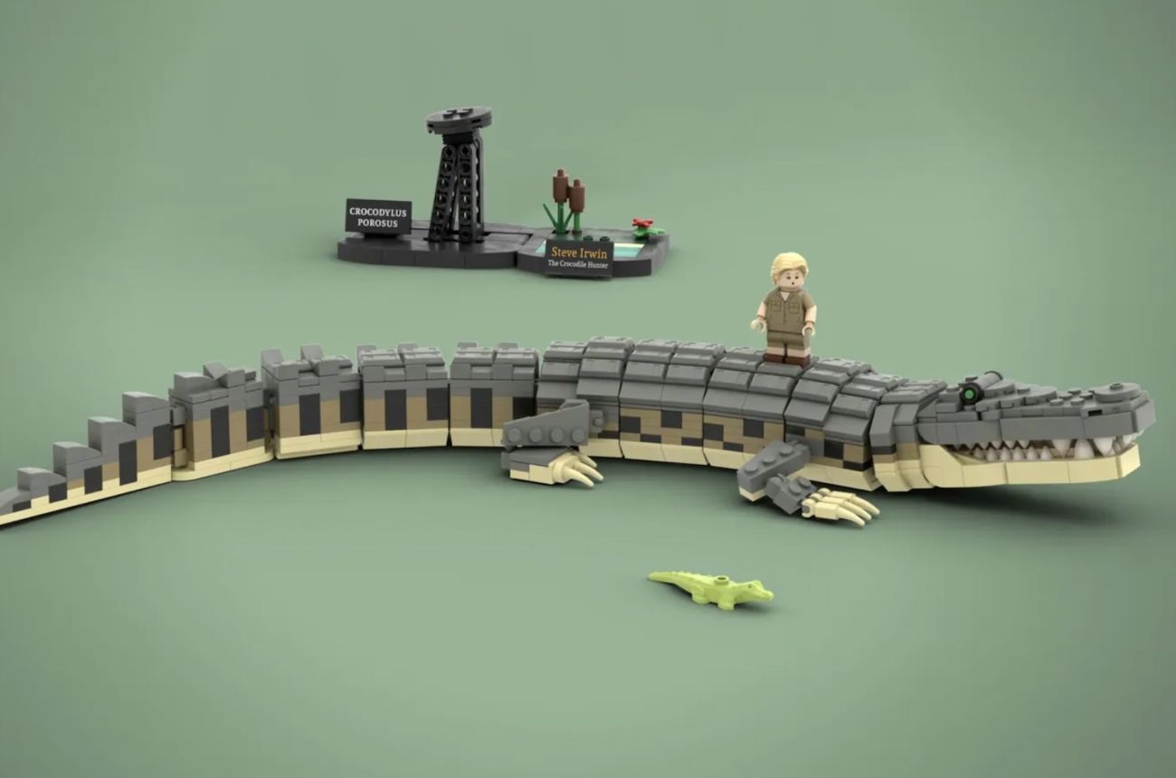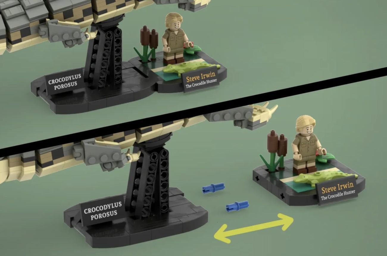 Auch wenn sich Steve Irwin für verschiedene Tierarten interessiert hat, waren Krokodile seine große Leidenschaft. Entsprechend zeigt das LEGO Ausstellungsstück ein Australisches Salzwasserkrokodil sowie Irwins Minifigur. Das Krokodil kann aber auch von seinem Standfuß abgenommen und als Spielmodell genutzt werden. Mit neun Körpergelenken, beweglichen Beinen und einem beweglichen Kiefer ist die Beweglichkeit unglaublich.