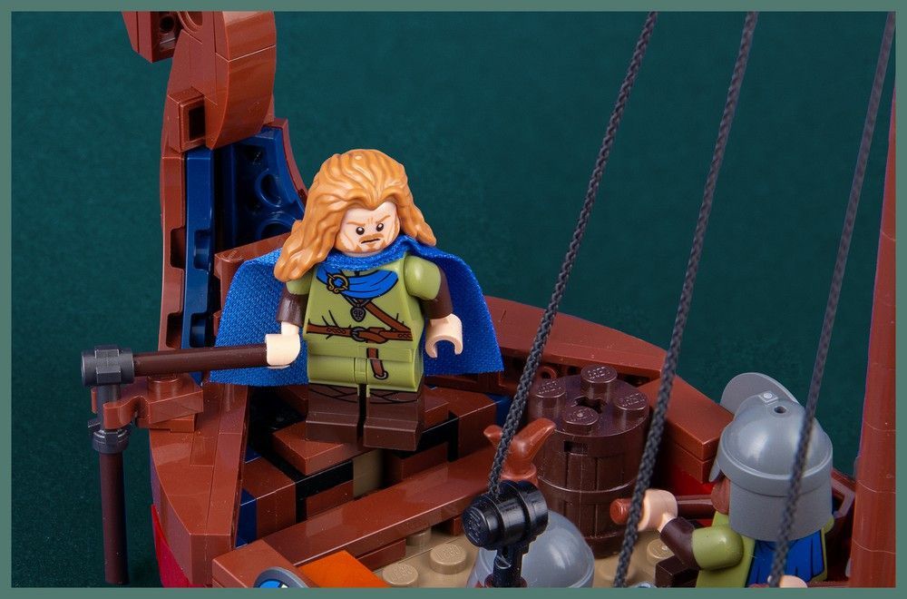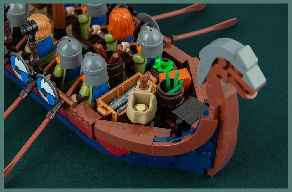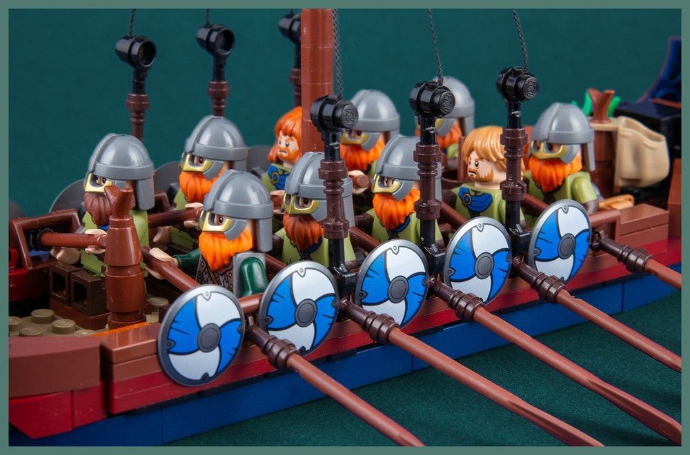 Ganze 11 Minifiguren haben in dem schlanken Schiff Platz, zehn Männer an den Rudern und einer am Steuer. Die Schilde der Wikinger sind griffbereit am Schiffsrand befestigt und vorne lagern Proviant und Beute der letzten Raubzüge.