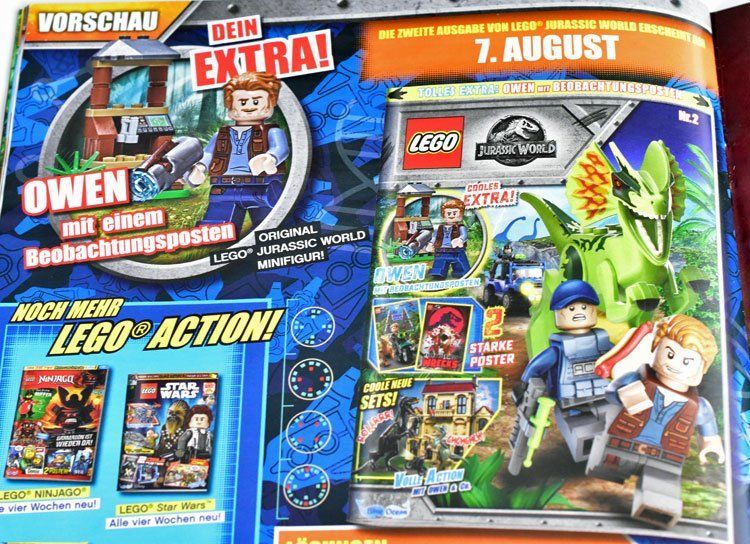 Wir haben das Heft dank eines Spielwarenhändlers bereits vorliegen und haben natürlich gleich einen Blick auf die vorletzte Seite mit der Vorschau auf die zweite Ausgabe geworfen. Demnach erscheint das nächste LEGO Jurassic World Magazin am 07. August und dürfte für Fans der Reihe vielleicht sogar noch interessanter sein. Das Heft hat nämliche eine Owen Minifigur samt Stud-Shooter und einem Beobachtungsposten an Bord.