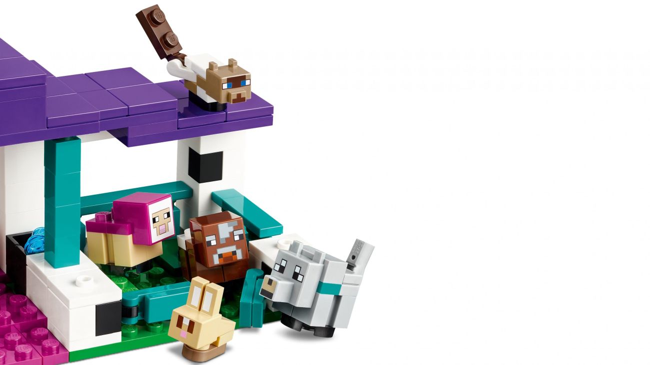 Besonders interessant ist das neue Tierheim mit 206 Teilen für 19,99 Euro. Hier bekommen wir zwei Figuren, einen neuen Skin und ein Baby-Zombie und die 5 Baby-Mobs Schaf, Kuh, Hund, Katze und Hase. Mit dabei ist ein kleiner Stall und ein Picknick in einer interessanten Farbkombination. Das Biom ist nämlich ein Kirschberghain mit einem Kirschblütenbaum.