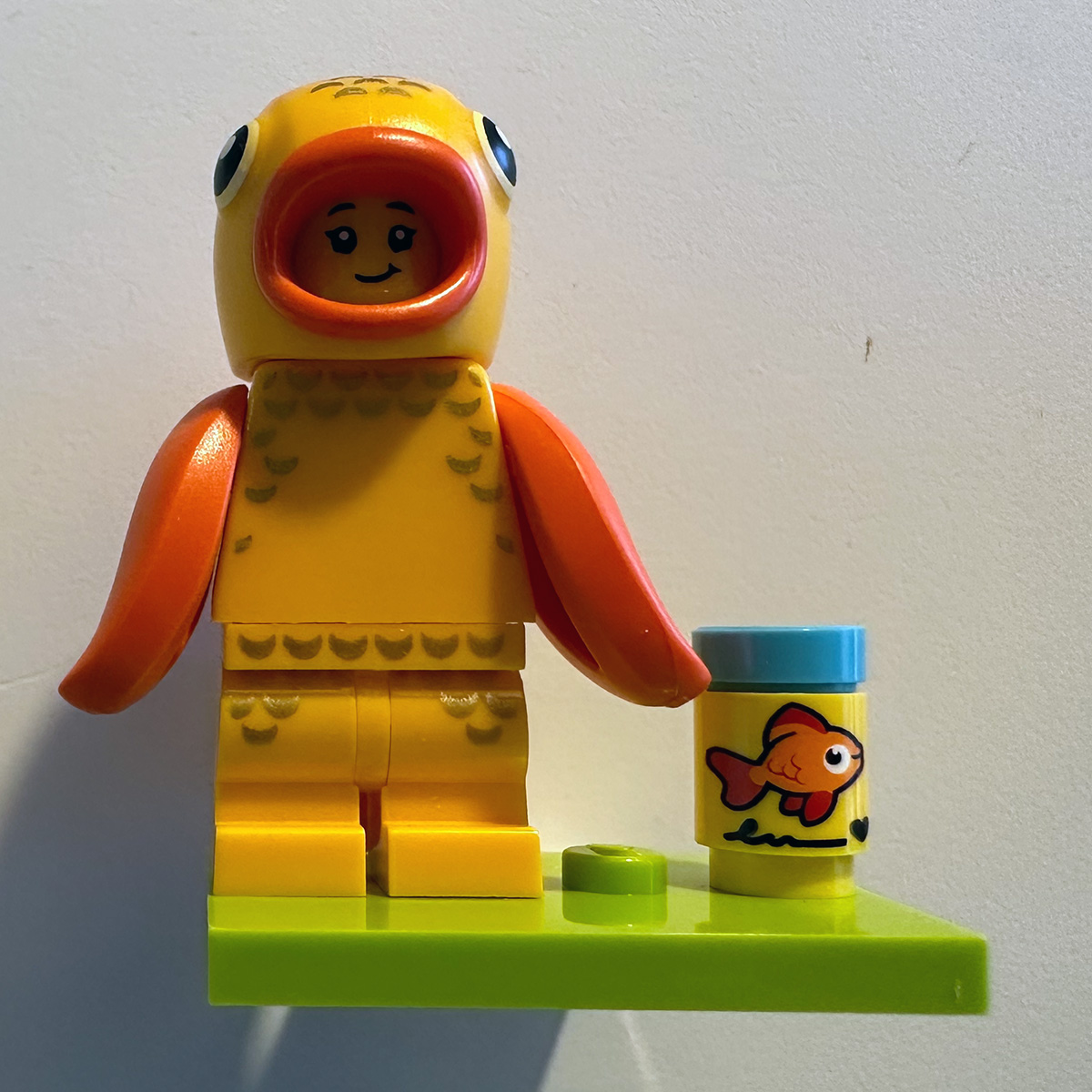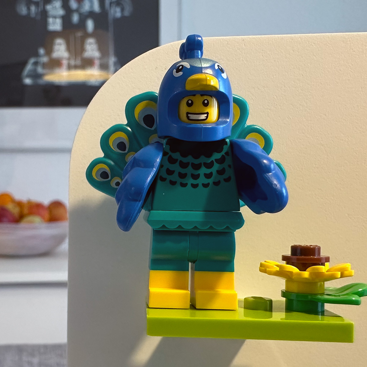 Los geht es mit den ersten vier Tierkostüm-Figuren: ein Pfau, eine Katze, ein Goldfisch und ein Affe. Jeder Figur haben die Designer in Billund ein Zubehör-Teil spendiert. Wie bei den Sammelfiguren üblich, sind die Torsos beidseitig bedruckt. Der Federschmuck beim Pfau ist klasse, weniger originell finde ich die Blume als Zubehör. Die Katze hat einen Spielball spendiert bekommen, der Affe eine Banane und der Goldfische eine Dose Fischfutter.