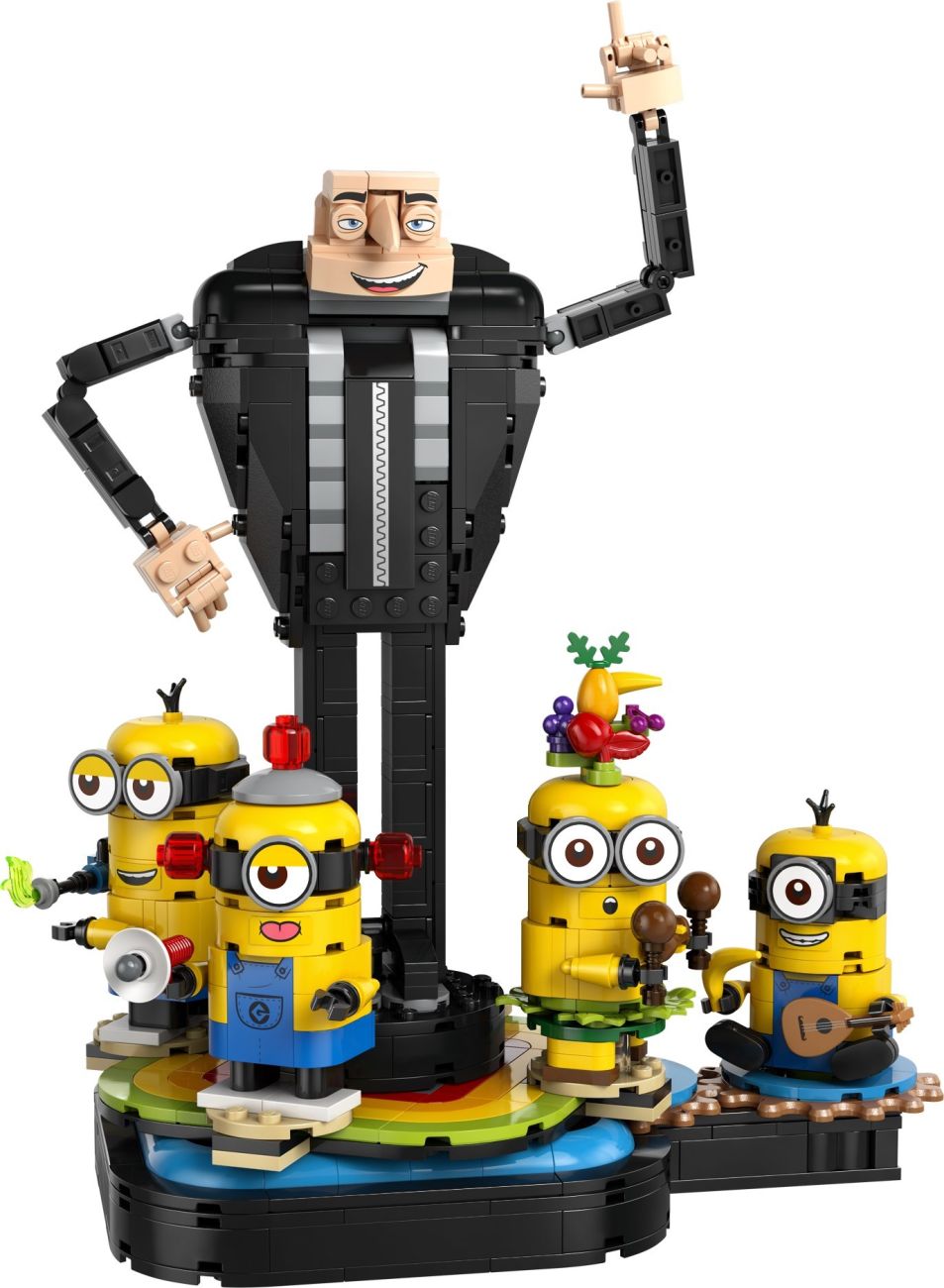 Im Set 75582 Brick-Built-Gru and Minions bekommen wir einen gebauten Gru samt 4 Minions, alle in unterschiedlichen Outfits. Hierbei sind sichtbar einige Teile bedruckt, allerdings auch Teile der Minions mit Stickern versehen. Weiterhin auffällig ist die Konstruktion der Hände von Gru. Die Protagonisten sind über eine Zahnradkonstruktion miteinander verbunden und drehen sich gleichzeitig auf der Platform.
