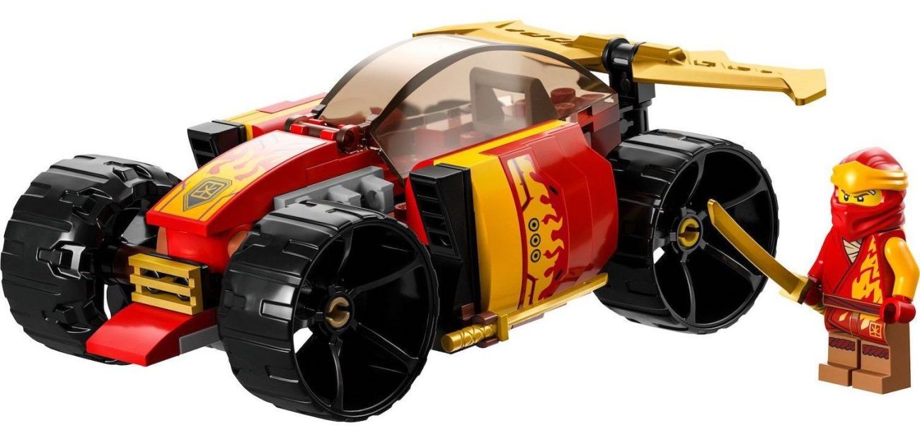 Kais Ninja-Rennwagen EVO kommt nur mit einer Minifigur von Kai. Für 9,99 Euro bekommen wir 94 LEGO Teile, mit denen wir seinen kleinen, aber dennoch wuchtigen Rennwagen mit den großen schwarzen Reifen und einer großen Windschutzscheibe bauen können.