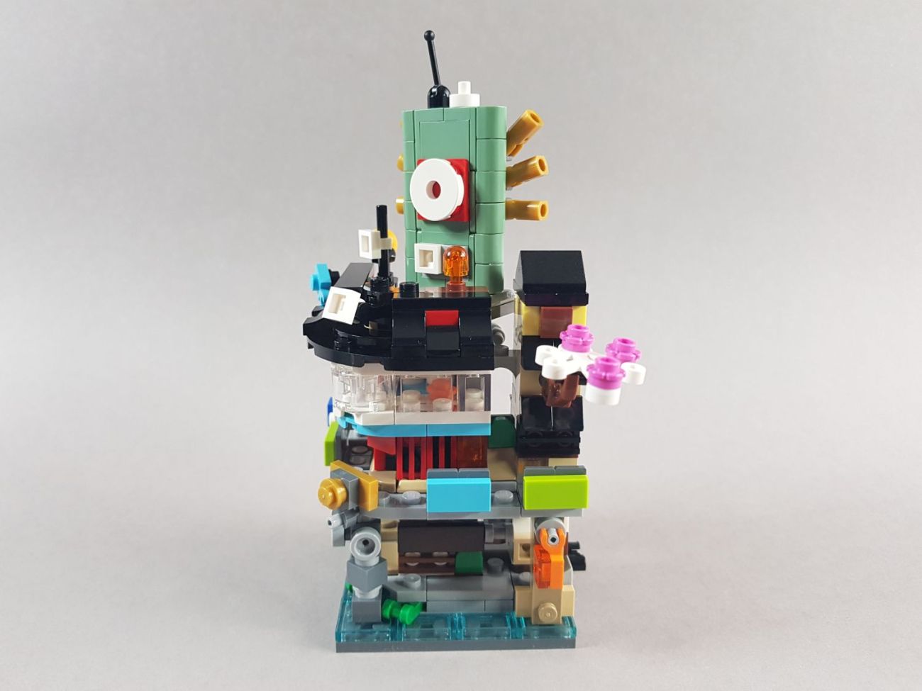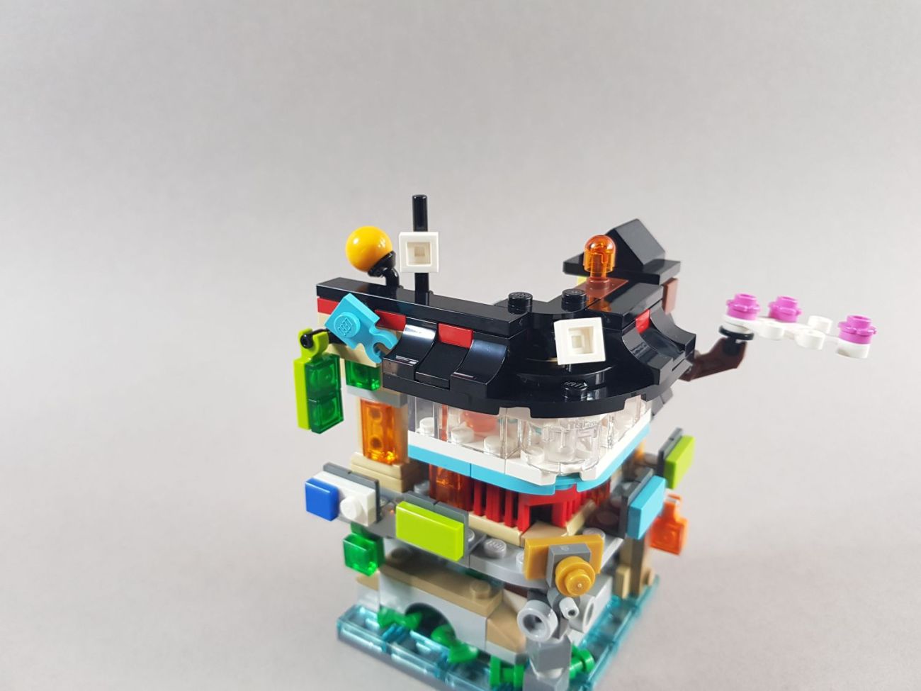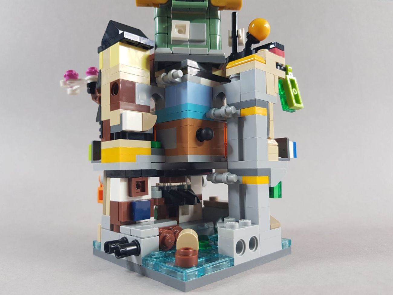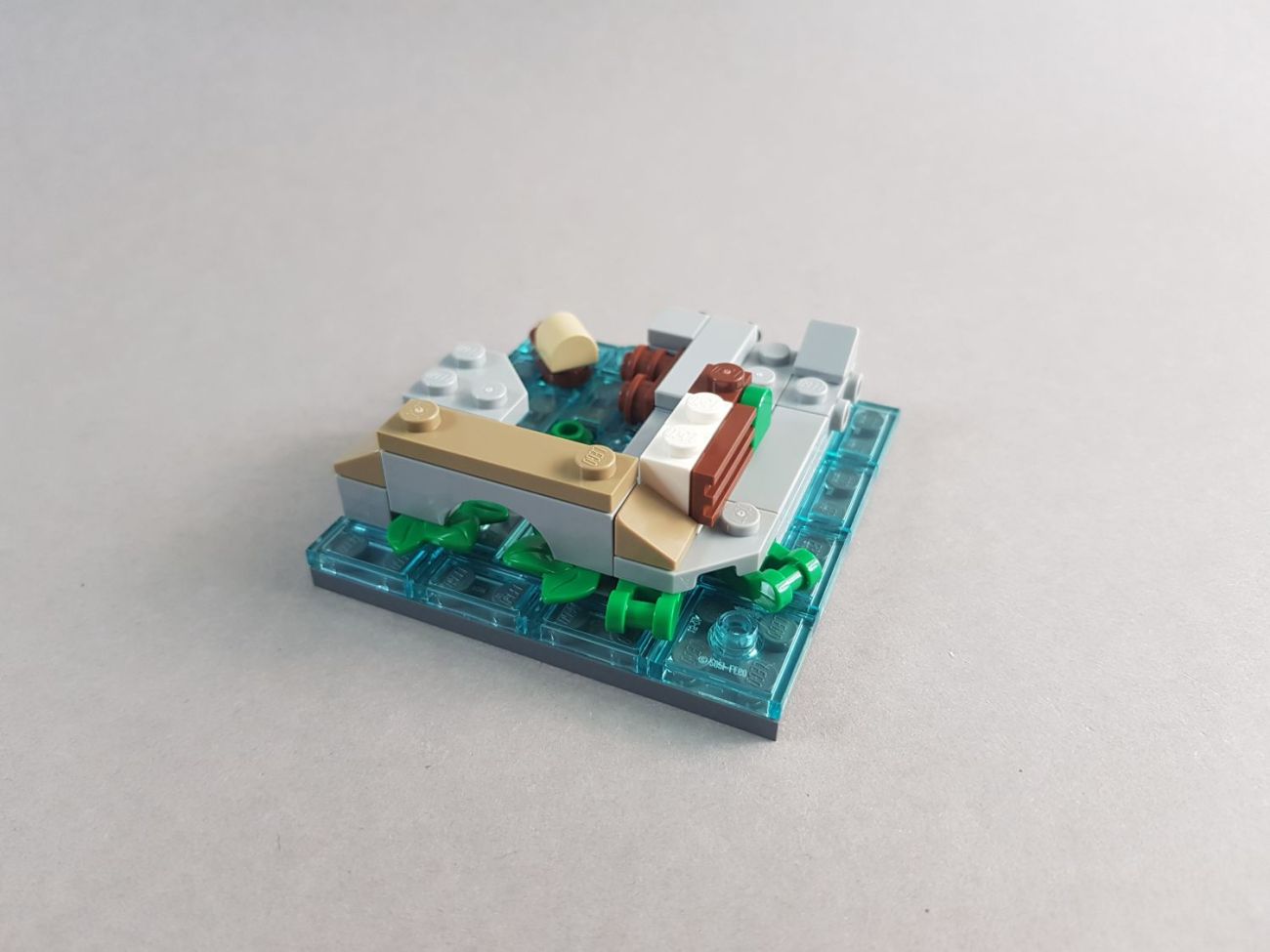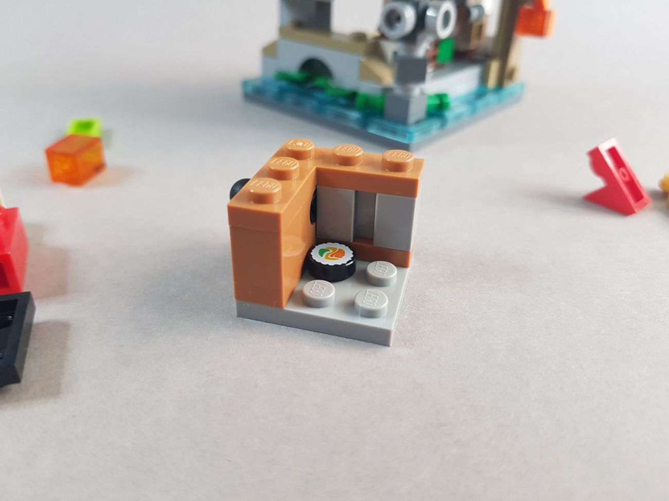 Der Aufbau ist sehr einfach und schnell gemacht. Unter den 339 LEGO Teilen sind nicht besonders viele große Teile dabei und mir sind auch keine exklusiven Teile aufgefallen. Ganz interessant fand ich auch die kleine 1×1 Fliese mit dem Sushi, welche an der Stelle verbaut ist, wo das Krabbenrestaurant im Originalmodell ist.