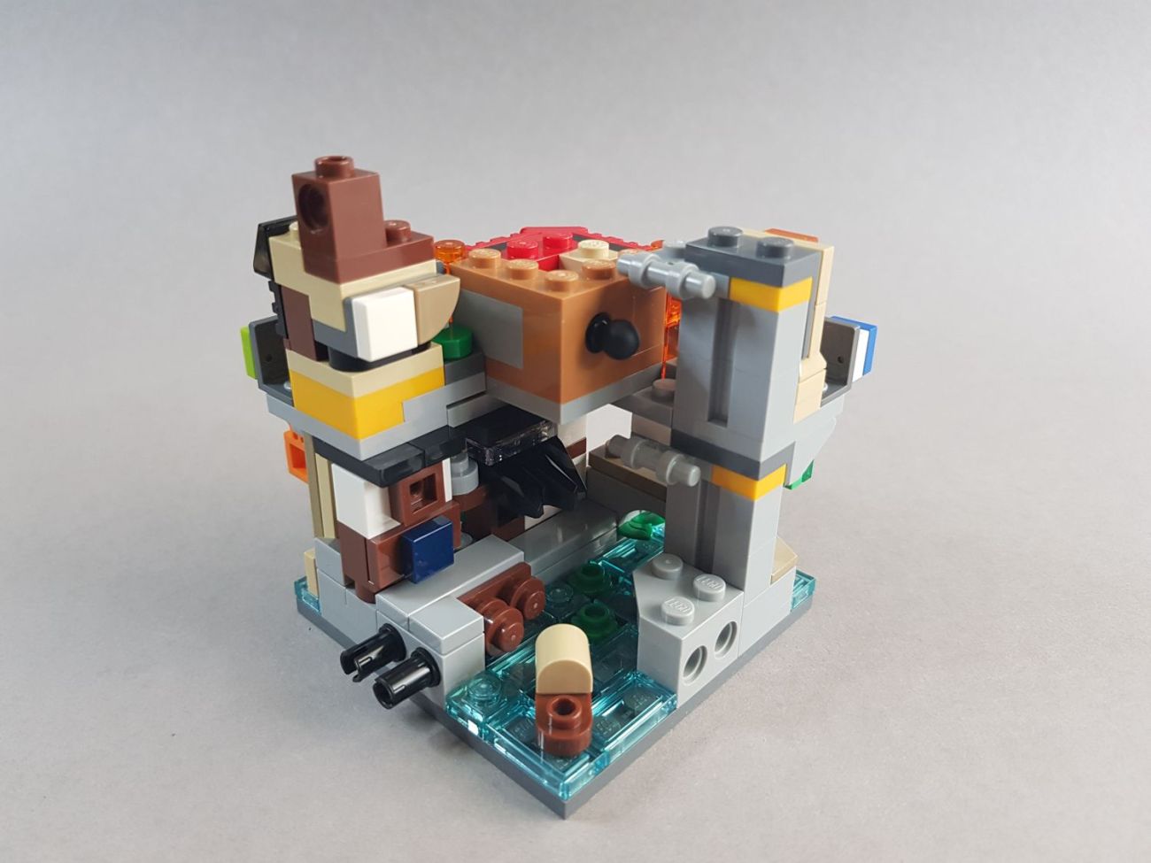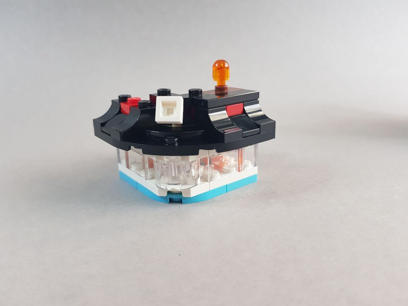 Das kleine Set ist knapp 16 cm hoch und 7 cm breit und tief. Dieses kleine Modell sieht dem großen Modell sehr ähnlich und passt auch von den Größenverhältnissen sehr gut. Man kann sofort die ikonischen Merkmale erkennen wie den großen Turm auf dem Dach, den kleinen Baum an der Seite oder die transparenten Schilder an den Seiten. Auch das Wasser ist gut umgesetzt worden und sogar das kleine Boot aus dem original Set gibt es noch. Farblich passen alle Elemente auch zum großen Original.