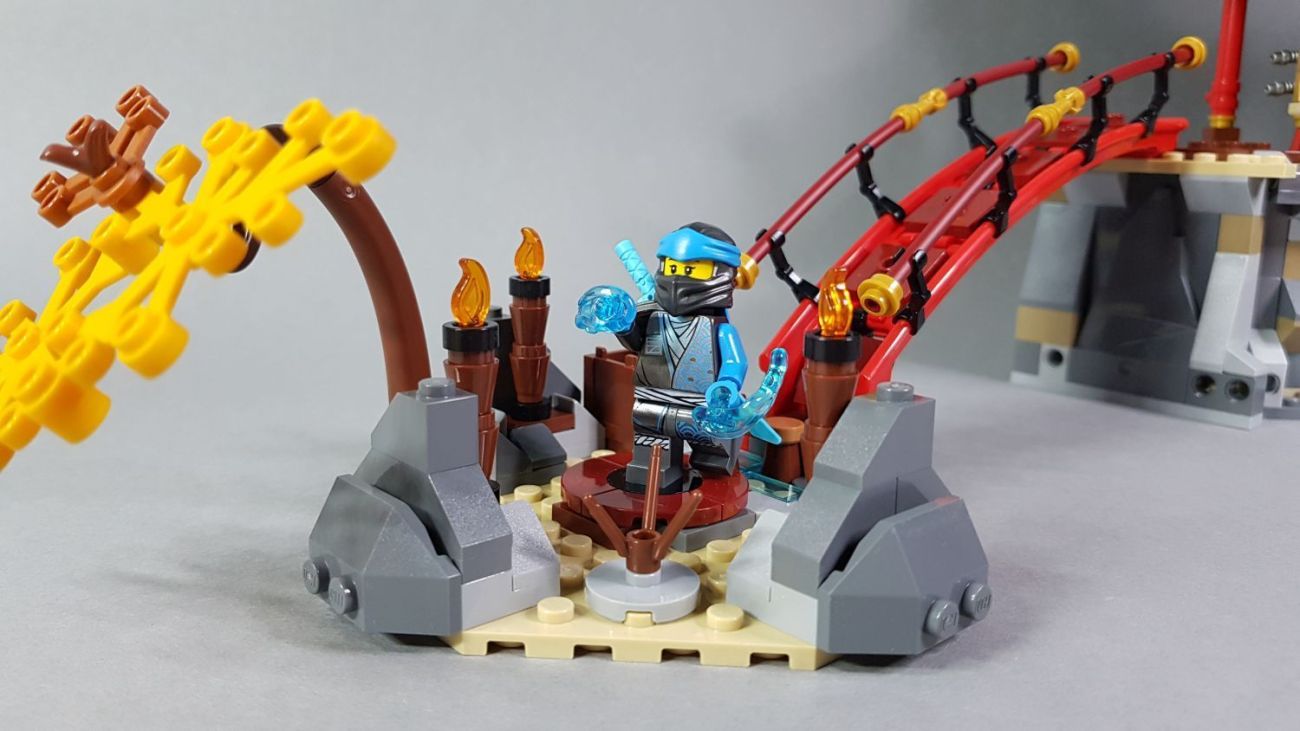 Der Übungsplatz lässt sich über eine kleine Brücke erreichen, welche aus einem Teil für Achterbahnen gebaut wurde. In einer Kiste liegen 2 blaue Power-Blast-Teile, mit denen Nya die Flammen löschen kann. Diese liegen nämlich nur lose auf den braunen Zylindern und können weggeschossen werden.