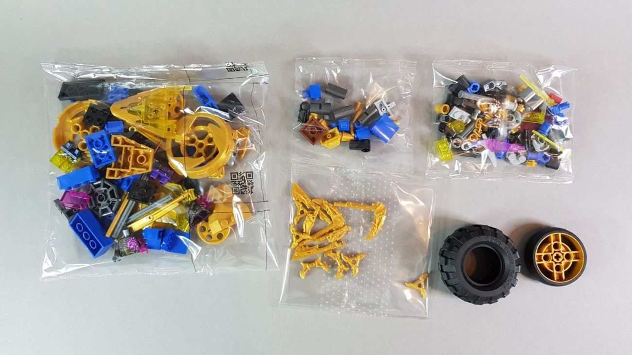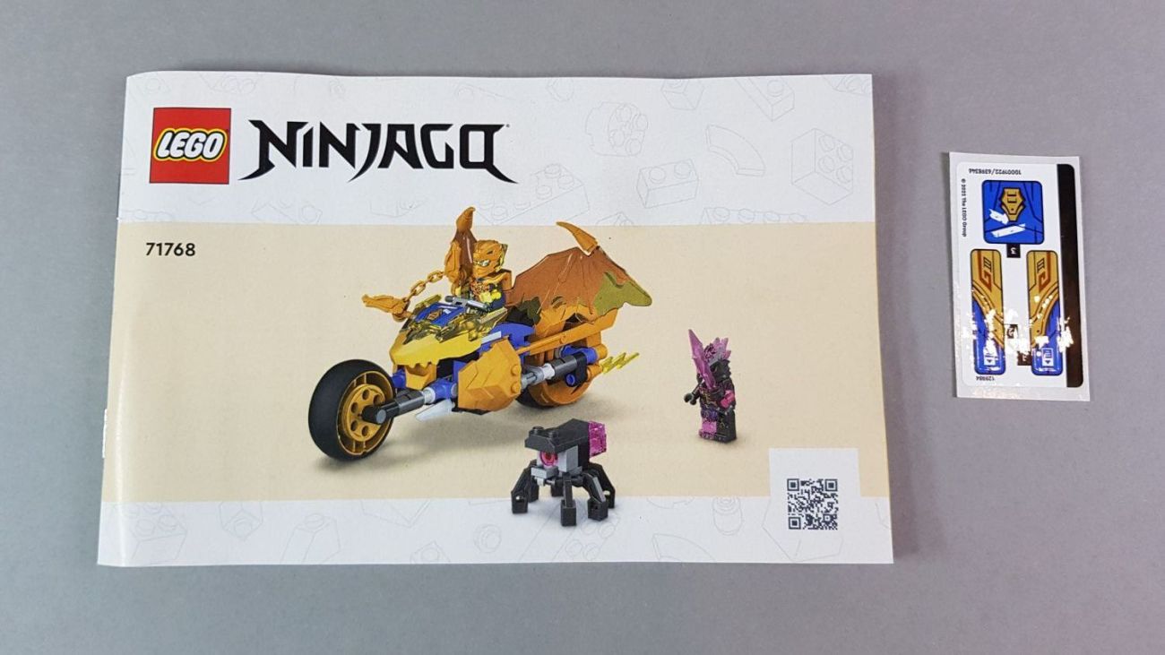 Das kleinste Set hat auch den kleinsten Karton mit 26 cm breite, 14 cm höhe und 6 cm tiefe. Neben der Anleitung gibt es einen kleinen Stickerbogen mit drei Stickern und zwei lose Reifen. Die vier Tüten sind nicht nummeriert und eine der vier Tüten gibt uns wieder die neuen goldenen Waffen. Normalerweise gibt es selbst bei den kleinen Motorrädern zwei Bauabschnitte, durch die geringe Teileanzahl war dies hier wahrscheinlich nicht nötig.