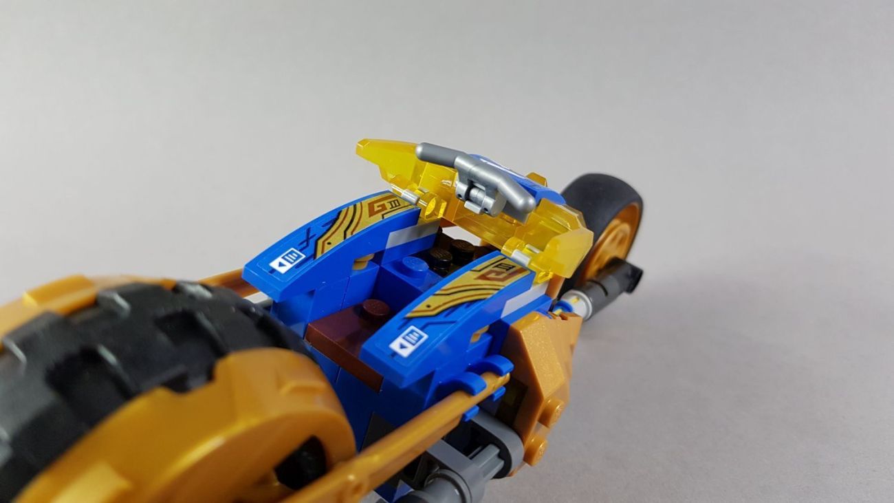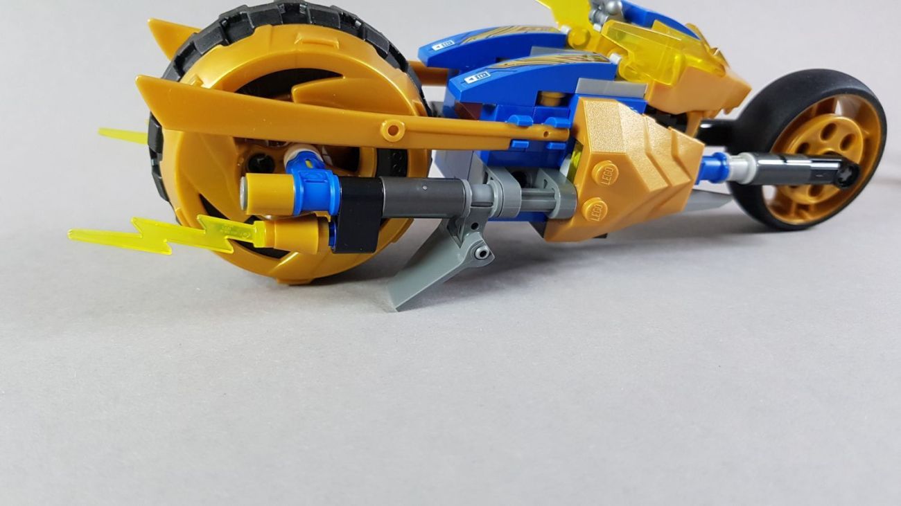 Das Motorrad ist 18 cm lang, 6 cm breit und 6 cm hoch. Die goldenen Elemente ziehen sich über das ganze Motorrad und sind genauso präsent wie die blauen. Einen Drachenkopf hatten wir auch schon bei Zanes Golddrachen-Jet(71770) und er passt gut zu der Größe, aber ich hätte mir gerne ein größeres Motorrad für Jay gewünscht.