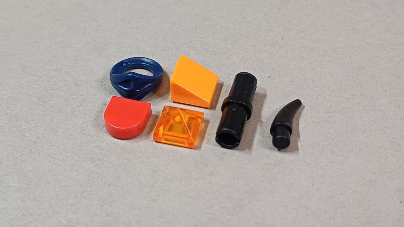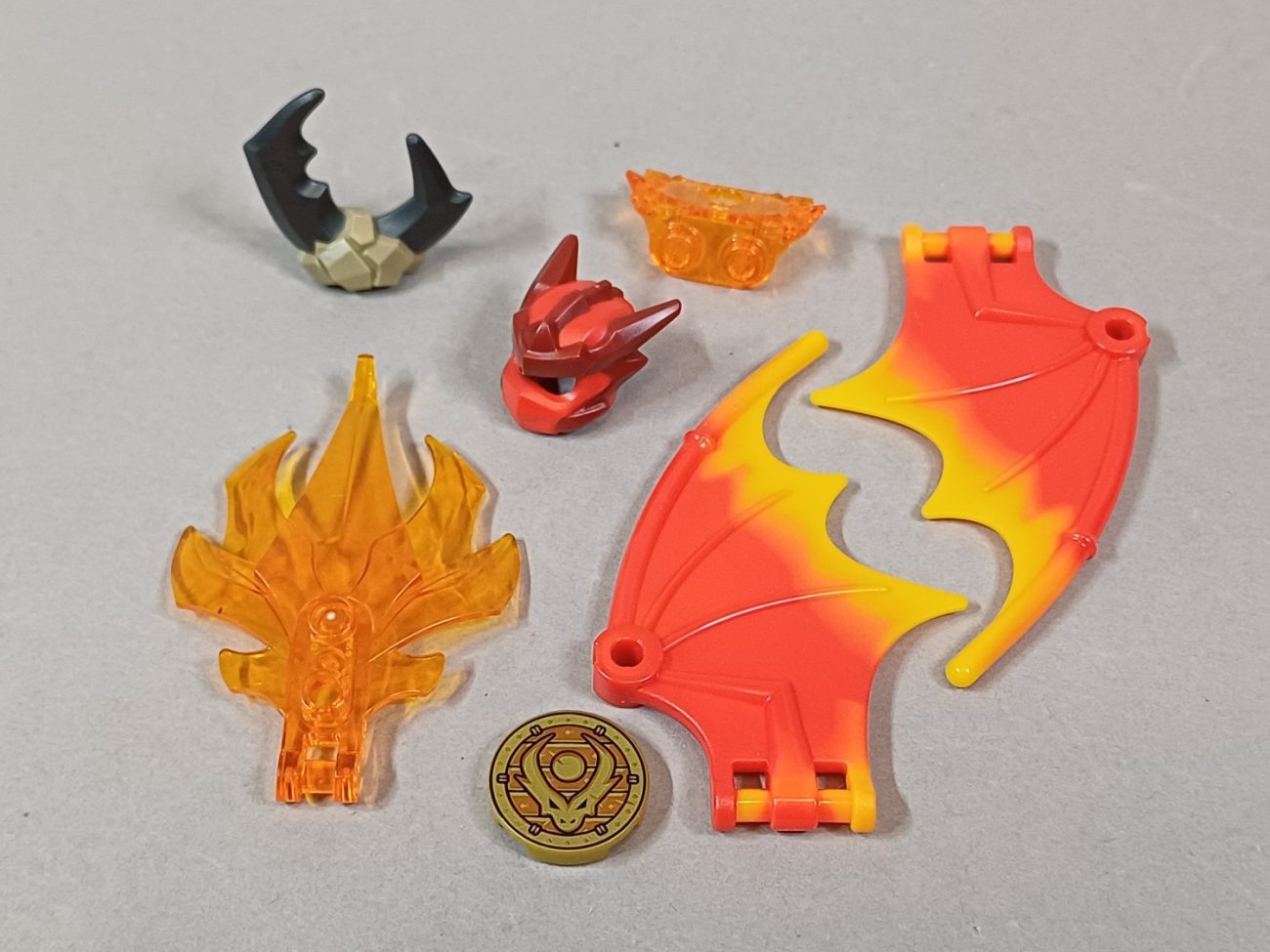 Neue Elemente sind für viele besonders spannend. Hier bekommen wir neben den coolen neuen Helmen für die Minifiguren auch ein neues transparentes Element für den Schwanz, welches in den neuen Sets vermehrt auftaucht. Dazu haben wir auch noch die Kristallrüstung in transparentem Orange und eine neue Bedruckung für die runde Fliese.