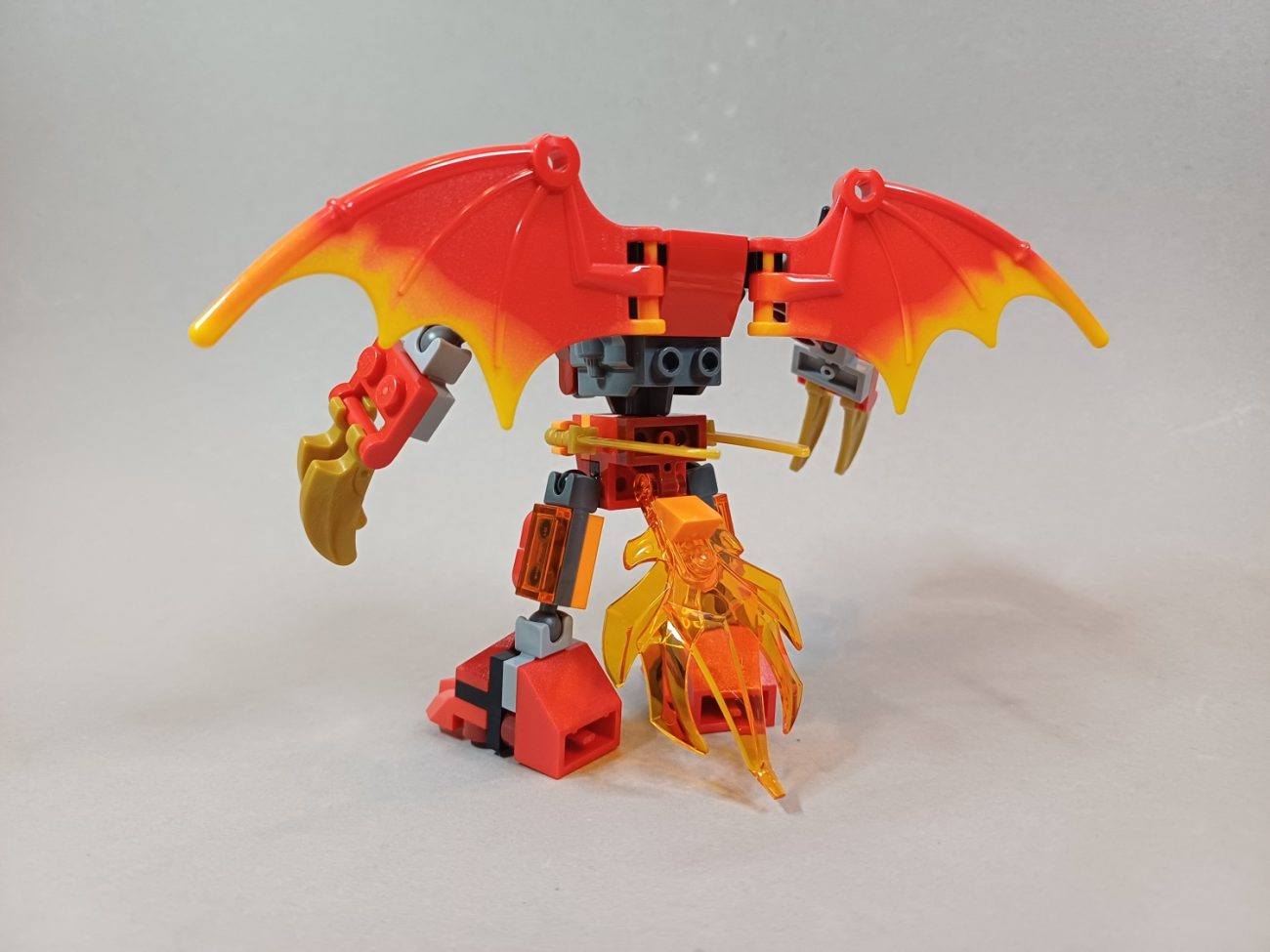 Der Mech gefällt mir sehr. Die Proportionen sind gut gelungen, die Farben passen natürlich zu Kai und auch das Drachendesign mit den Klauen, Stacheln und Flügeln wurde hier sehr gut umgesetzt. Das neue Element auch als Drachenschwanz zu verwenden gefällt mir ebenfalls sehr und auch die Flügel passen farblich und vom Masstab her sehr gut zusammen. Und der Mech hat sogar zwei Halterungen für Kais Katanas.