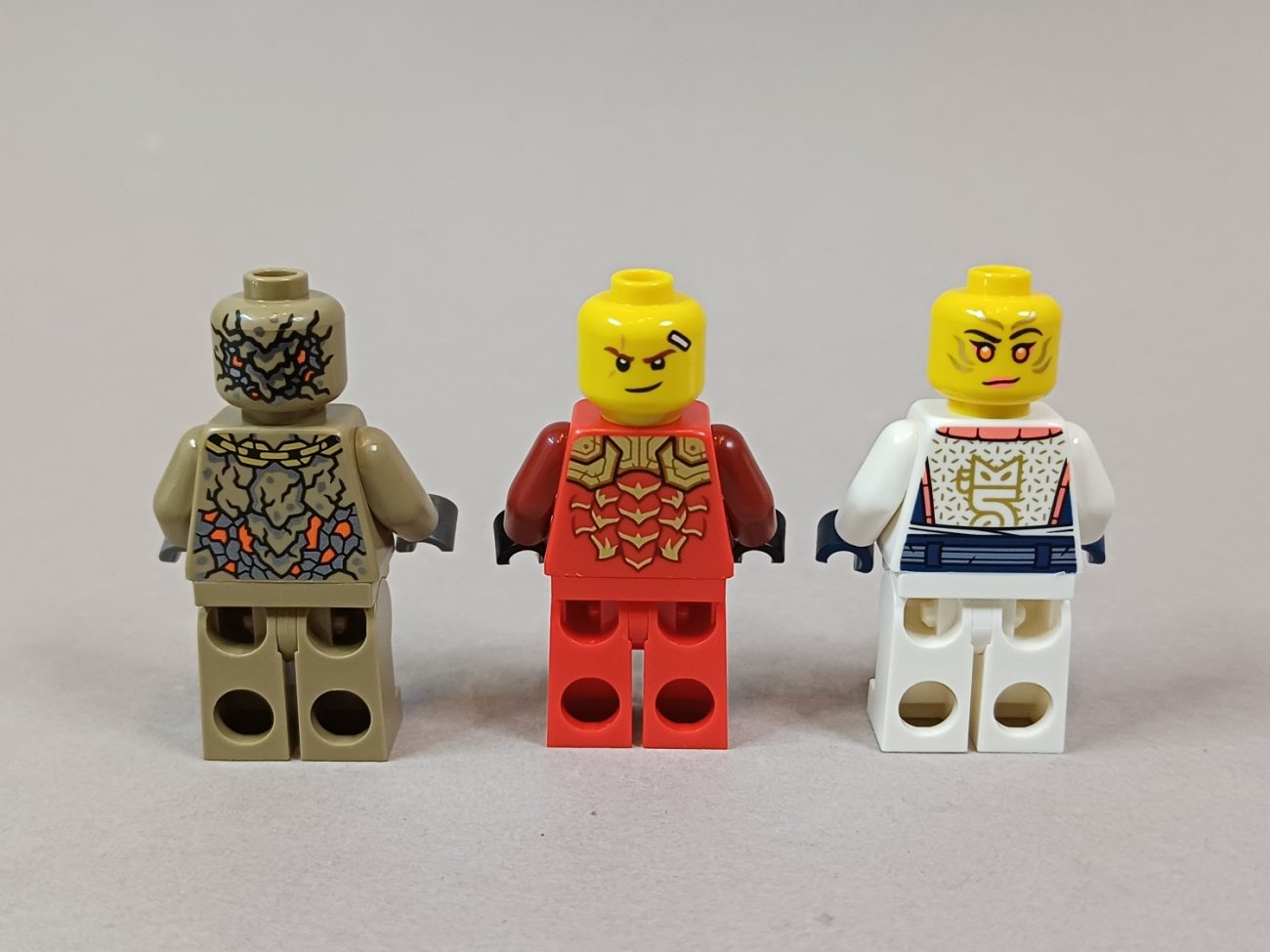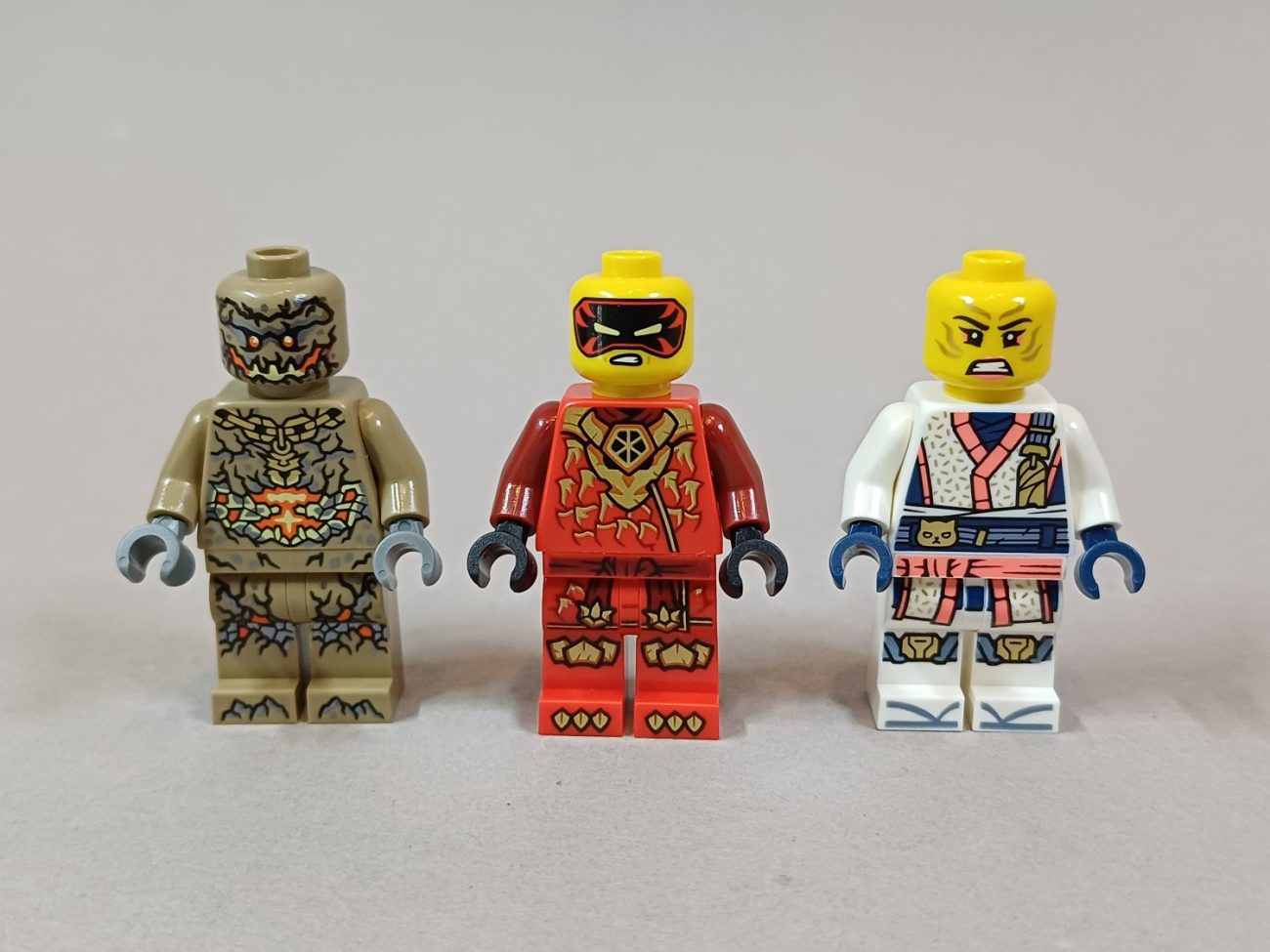 Wie beim letzten Battle Set gibt es auch hier drei Minifiguren: ein böses Erdmonster und die Ninja Kai und Sora. Bei Sora handelt es sich um ihren Anzug aus der letzten Staffel, gemischt mit der Rüstung aus dem Turnier der Quellen. Eigentlich finde ich es schade, dass wir hier eine alte Figur erhalten und keine neue, aber andererseits kann ich mir gut vorstellen, dass sie noch in vielen Samlungen fehlt. Sie gab es in dem großen Jet Mech von Lloyd (71845), welcher mit 99,99 Euro nicht gerade günstig ist und Rontu den Meisterdrachen (71842), welcher leider sehr schlecht umgesetzt wurde und im Verhältnis viel zu teuer ist.