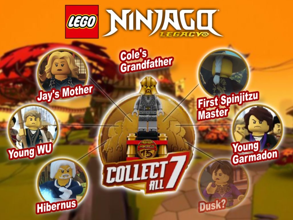 Auf der Rückseite der Box gibt es auch ein sehr interessantes Symbol, welches die Silhouetten der sieben Sammelfiguren zeigt. Ninjago Fans können eins und eins zusammenzählen und die fehlenden Minifiguren erkennen und auch die ersten Gerüchte bestätigen die Vermutungen. Garantiert sind die Figuren jedoch nicht zu 100 % wie zum Beispiel die letzte Figur. Es könnte sich um Dusk handeln, eventuell aber auch eine andere Minifigur. Im folgenden Bild haben wir euch die vermuteten Charaktere ein mal zusammengefasst. Fans warten schon seit Ewigkeiten auf Minifiguren dieser Charaktere, besonders vom ersten Spinjitzu Meister!