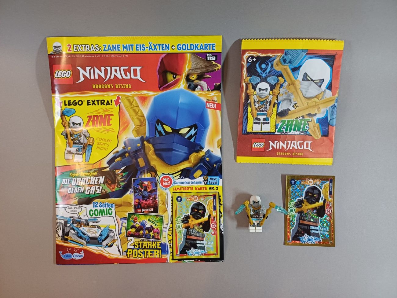 Im neuen LEGO Ninjago Magazin#119 von Blue Ocean gibt es eine bisher exklusive Minifigur von Kletter-Zane und einer Goldkarte vom LEGO Ninjago Sammelkartenspiel. Das Heft ist für 5,99 Euro erhältlich und kommt leider ohne einen Sammelkartenbooster. Warum sich das Heft trotzdem lohnt und auch die nächste Ausgabe etwas Besonderes ist, schauen wir uns hier an.