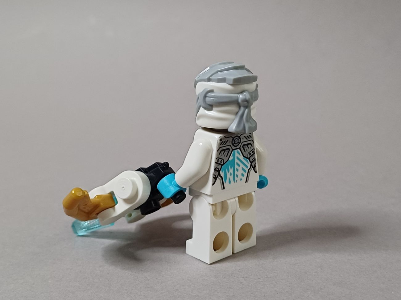 Bei der Zane Minifigur habe ich gemischte Gefühle. Von der Waffe bin ich eher enttäuscht, da sie nicht besonders spannend ist. Zwar hat sie ein paar coole Teile, aber irgendwie ist sie auch nichts Neues und ich würde mir mal etwas anderes als diese Waffen wünschen. Die Figur gefällt mir da deutlich mehr, ist aber auch nicht perfekt, da hier wieder ein mal die Schulterrüstung fehlt. Das Metallische und technische Design passt perfekt zu Zane und auch die Maske hat ein interessantes Design, da sie an die Anzüge beim Skydiving angelehnt sind.