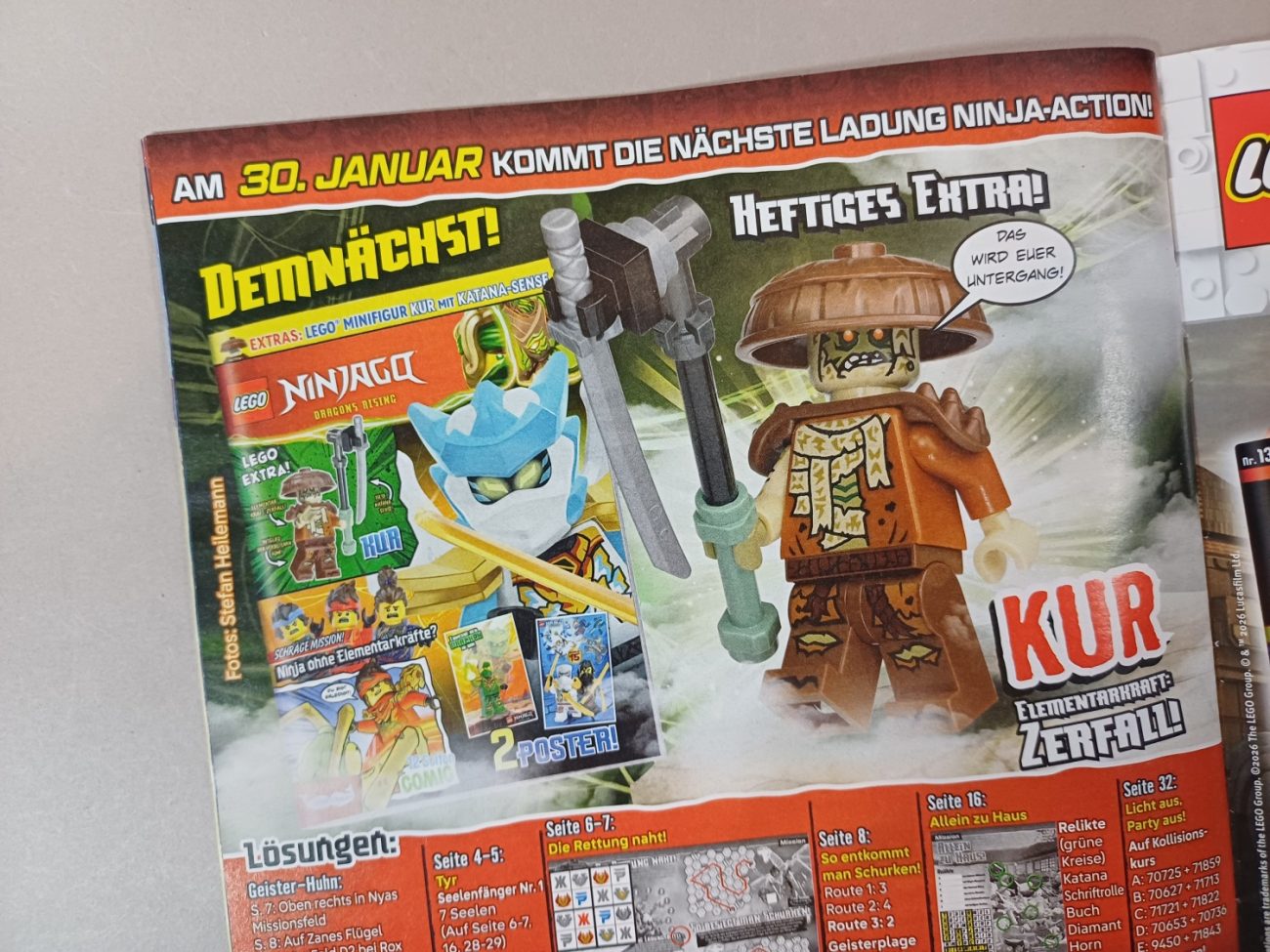 Das nächste Magazin ist schon wieder ein Highlight! Denn hier erhalten wir Kur mit der Elementarkraft des Zerfalls (njo0978). Diese Minifigur gibt es ebenfalls nur in dem großen Jet Mech von Lloyd (71845) und ist auf Bricklink nicht für unter 30 Euro zu bekommen. Somit fällt nicht nur der Preis der Figur, wir haben nun auch vier von fünf Mitgliedern der Verbannten Fünf im Heft erhalten und ich bin mir ziemlich sicher, dass wir Rox, die zweite Anführerin auch noch erhalten werden. Das Heft erscheint erst Ende Januar und hat auch wieder ein neues Legacy-Poster mit Cole und Zane, passend zu dem Poster aus diesem Heft.