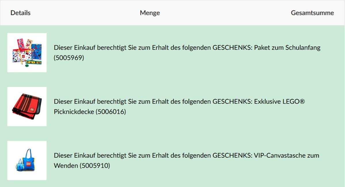 Ich finde es sehr nett, dass ich heute, wenn ich bei Lego über 200.- Euro einkaufe, 3 Dinge geschenkt bekomme. Das gibt es in den Geschäften wo ich sonst einkaufe doch eher selten. Ich finde es sehr vermessen, dass von einigen hier, sofort alles schlecht gemacht wird und alles sofort in den Widerverkaufswert umgerechnet wird. Ich habe drei Kids, da wäre jetzt für jeden was dabei gewesen – Schulstart, Tasche für die Badesachen und ne Decke für den Badesee. Sehr nett. Natürlich kaufe ich nicht extra deswegen ein, aber ich bin jemand, der sich über Geschenke freut.