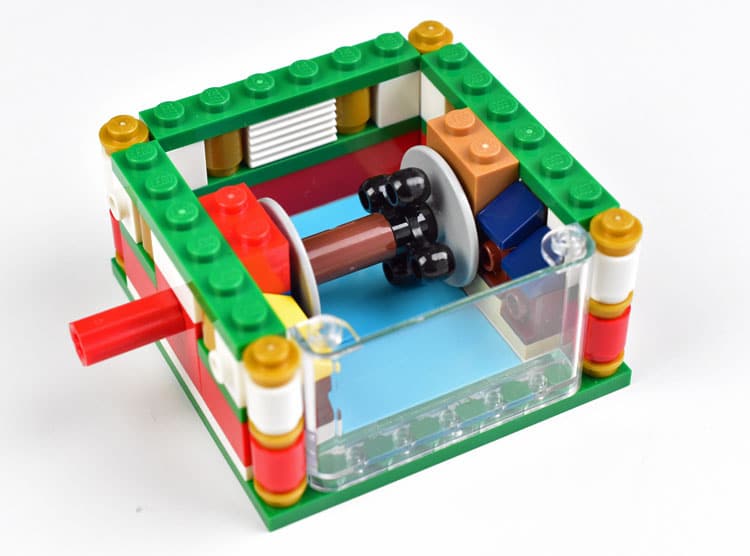 Zum Aufbau kann ich nur sagen: Ich hatte jede Menge Spaß dabei. Leider sind die 251 Teile schnell verbaut. Nach geschätzt rund 30 Minuten und 50 Bauschritten später steht das Weihnachtskarussell aufgebaut auf dem Schreibtisch und das Ergebnis gefällt mir richtig gut. Der Designer oder die Designerin hat hier wieder ganze Arbeit geleistet, genauso wie es sein muss. Los geht der Zusammenbau mit dem Sockel und dem Drehmechanismus. Die Idee mit dem Sichtfenster finde ich witzig, obwohl später aufgrund der schlechten Lichtverhältnisse im geschlossenen Sockel nicht mehr so viel zu sehen ist.