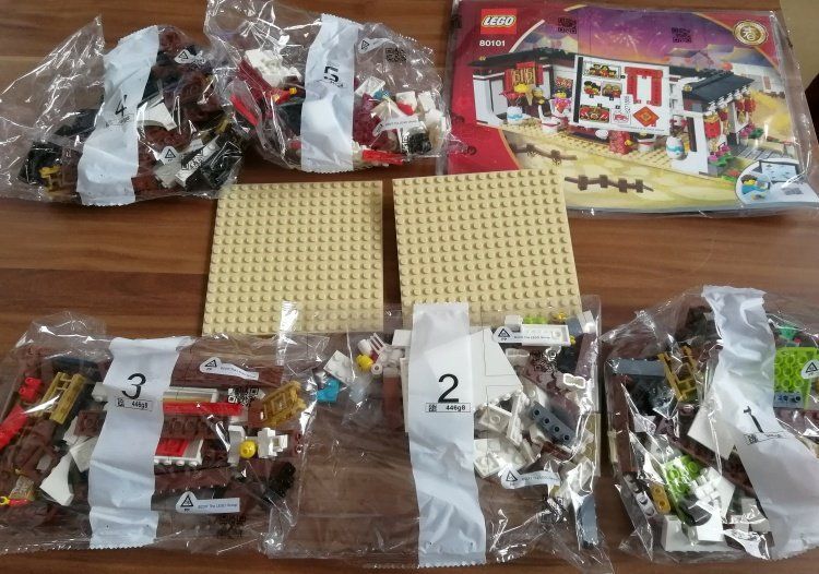 LEGO Seasonal 80101 Chinese New Year’s Eve Dinner im Leser-ReviewIn der (für mich) überraschend großen Box waren neben der Anleitung und zwei 16×16 Platten fünf Beutel mit den Teilen. Ein kleiner Stickerbogen mit neun Aufklebern ist auch dabei. Allerdings ist das ein kleiner Teil im Vergleich zu den 23 verbauten bedruckten Teilen.