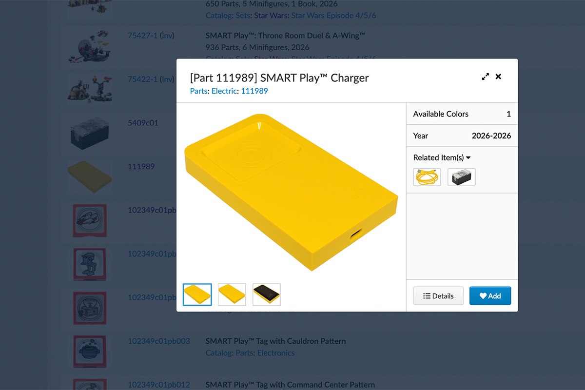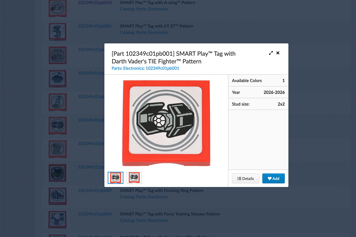 Auch die verschiedenen Smart Tags (Fliesen mit RFID-Chips) und Smart Figs (Minifiguren) aus den Sets sind in der Datenbank des Marktplatzes zu finden, allerdings nicht mehr ganz so einfach wie noch kurz nach dem Release.