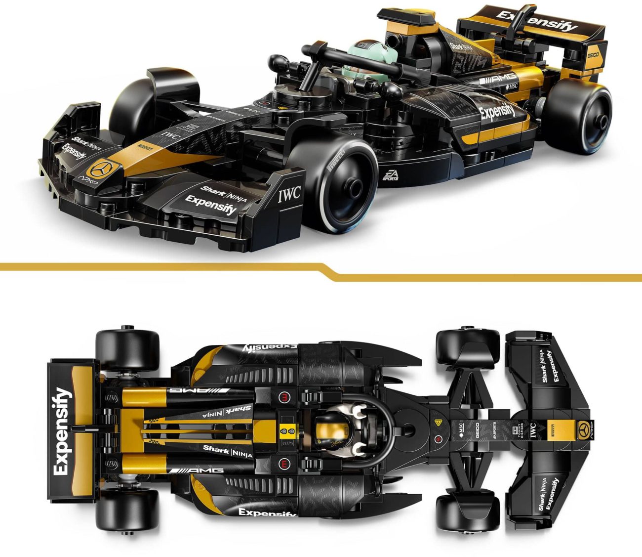 Dieser Umstand führt dann auch dazu, dass wir eine offizielle Brad Bitt Minifigur (Sonny Hays) in diesem Set finden, ergänzt durch seinen Filmpartner Damson Idris (Joshua Pearce), beide natürlich in Rennoveralls. Der Rennwagen wurde eigens von Mercedes für den Film entworfen und kommt in hauptsächlich schwarzer Optik garniert mir auffälligen Elementen in Gold. Das Set besteht aus insgesamt 268 Teilen und kann bereits im LEGO Onlineshop vorbestellt werden. Alle Bilder zur Januar-Neuheit findet ihr in unserem Beitrag.