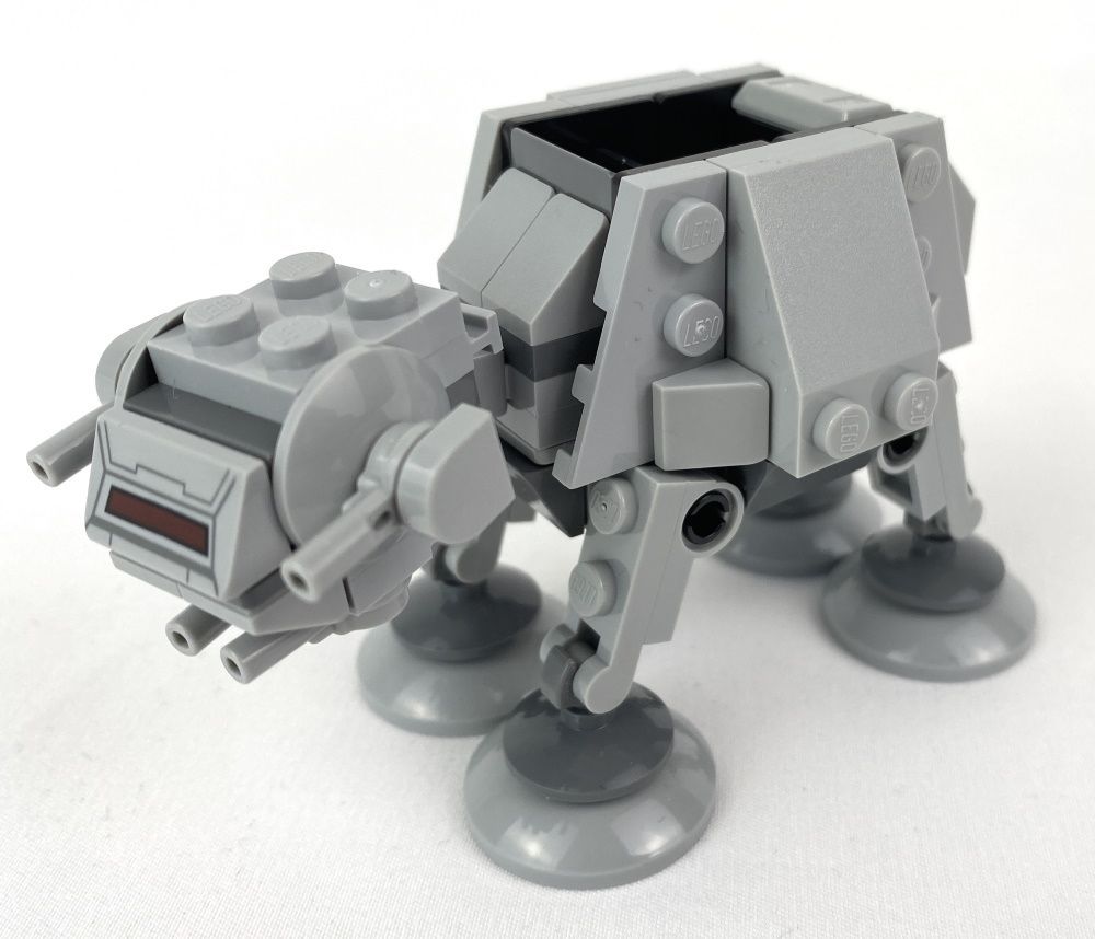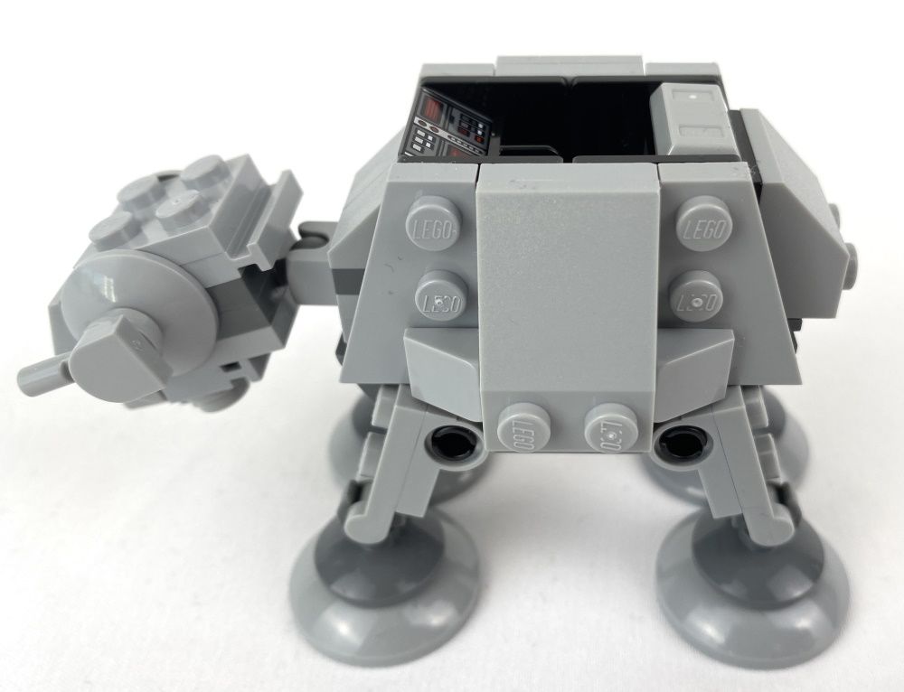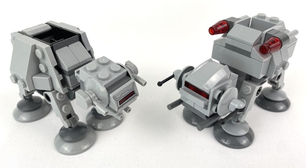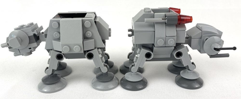 Ich habe euch hier mal den alten 75075 AT-AT zum Vergleich mit aufs Foto geholt. Wie ihr seht, ist die Beinmechanik bis auf den Farbtausch bei den Fußtellern ziemlich gleich. Der Kopf wirkt etwas filigraner und die beiden Shooter auf dem Rücken fehlen.