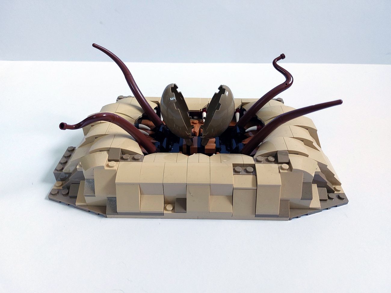 Die Grube an sich verwendet den größeren Teil der Steine des Sets und erreicht dementsprechend eine ordentliche Höhe. Das Design mit vielen Zähnen und den braunen Tentakeln gefällt mir hier richtig gut. Die Rückseite ist nicht vollständig verkleidet, hier finden sich Technic-Elemente, um die Tentakel zu bewegen. In der Mitte, wo das „Maul“ des Sarlaccs aus den beiden Halbschalen gebaut wird, kann man wie bereits bei früheren Versionen des Sets eine Minifigur einlegen.