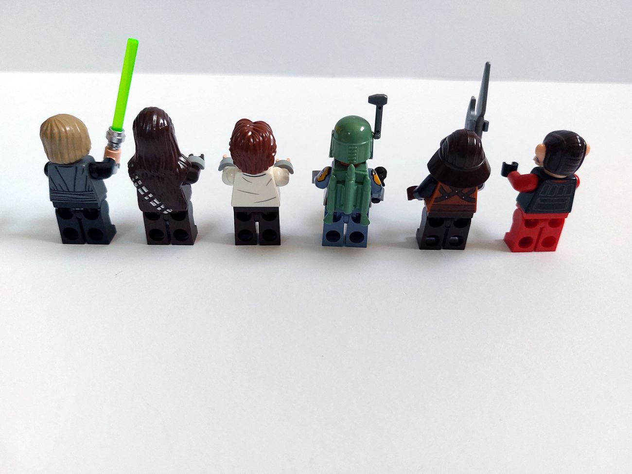 Weiterhin finden wir fünf Charaktere der ikonischen Szene: Chewbacca kommt hier im bekannten Mold und Druck, Boba Fett aus dem letztjährigen Mech mit bedruckten Armen und eine Neuauflage von Han Solo mit weißem Hemd, einmal mit geschlossenen Augen und einmal blinzelnd, da er gerade aus dem Carbonit befreit wurde. Außerdem eine Neuauflage von Lukes „Rückkehr der Jedi-Ritter“-Outfit auf Tatooine, mit bedruckten Beinen und der neuen Frisur sowie Lando Calrissian in Verkleidung eines Skiff-Wächters.