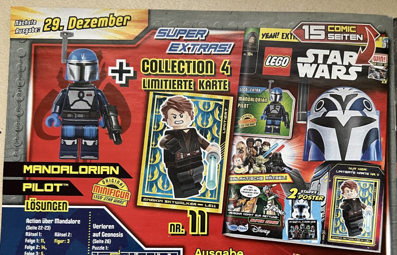 Im nächsten Heft, welches erst nach Weihnachten in den Handel kommt, erwartet euch wieder eine der beliebten Minifiguren. Blue Ocean nennt ihn „Mandalorian Pilot“, wenn man sich die Figur anschaut, erkennt man den Torso des „Mandalorian Fleet Commander“ (bei Bricklink sw1259), den es bisher exklusiv im Set 75348 „Mandalorian Fang Fighter vs TIE Interceptor“ gibt. Ob die passende Frisur auch beiliegt, kann man so noch nicht erkennen, der Helm mit Rangefinder ist aber auf jeden Fall drin.