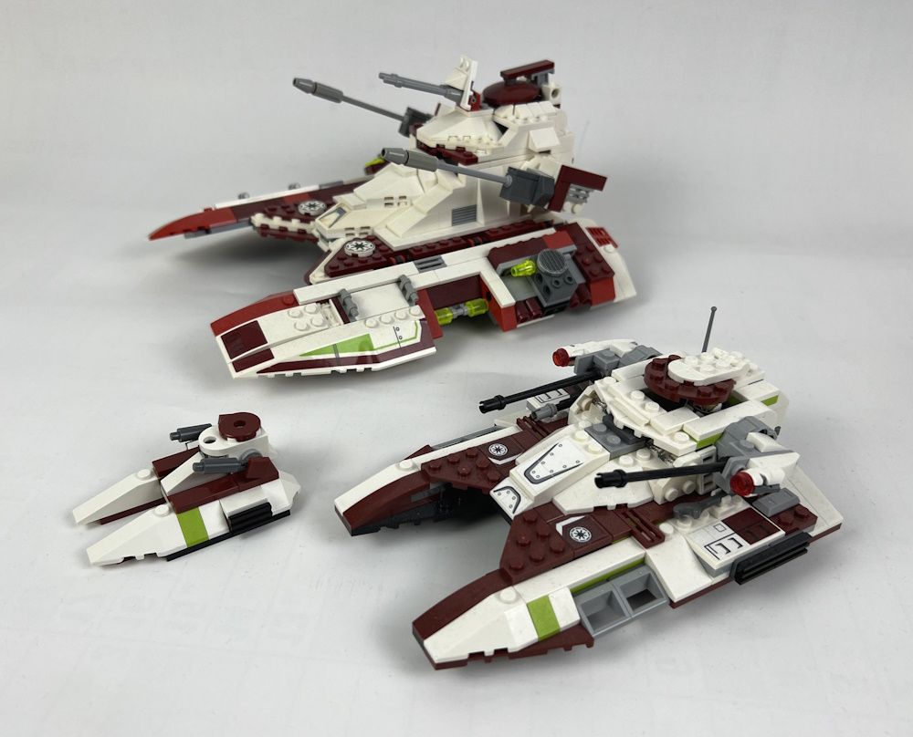 Das Farbschema stimmt schon mal, wenn man ihn mit seinen großen Brüdern vergleicht. Hinten der erste seiner Art, gleichzeitig der Größte, die 7679 von 2008. Vorne rechts der Nachfolger aus dem Jahr 2017, die 75182. Es fehlt hier das aktuelle Modell aus dem Jahr 2022, die 75342 (den habe ich leider noch nicht aufgebaut).