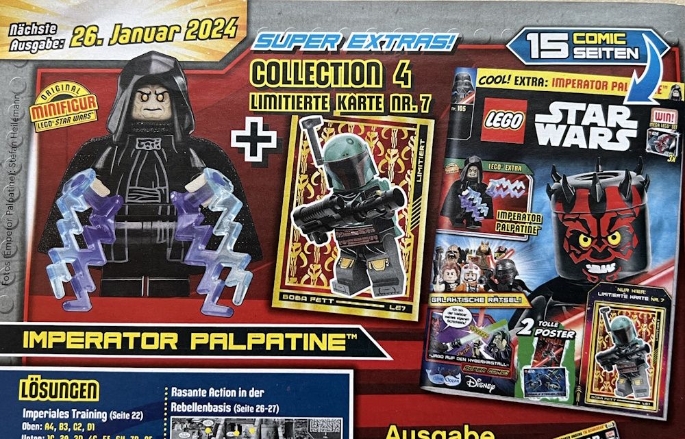 Es geht direkt weiter mit den Figuren. Im ersten Star Wars Magazin des neuen Jahres erwartet euch der nächste Knaller. Blue Ocean packt zur Ausgabe 105 Imperator Palpatine ein, inklusive zwei Machtblitzen und Cape. Die Figur müßte soweit ich das erkenne die aus dem Thronsaal Diorama 75352 sein – ebenfalls bisher ein Exklusive. Auch hier könnt ihr gegenüber den bisherigen Preisen einiges sparen, denn bisher wird für die Figur deutlich mehr aufgerufen, als ein Magazin kostet.