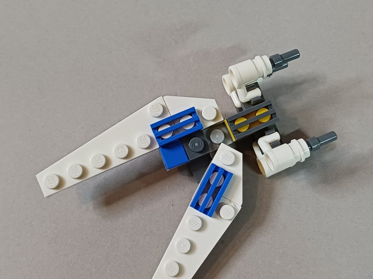 Der U-Wing wird aus 37 Teilen zusammengebaut und hat immerhin ein paar spannende Bautechniken. Für die Triebwerke werden einfach vier Tassen verwendet und die beiden Flügel kann man durch abgerundete Platten problemlos zur Seite drehen.
