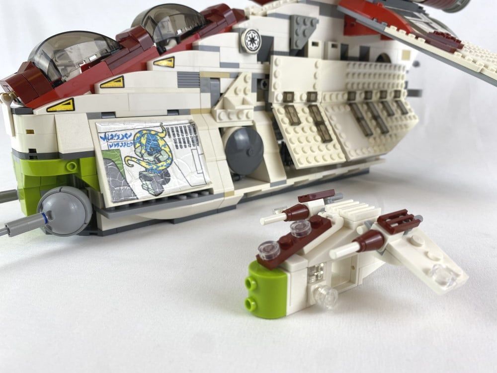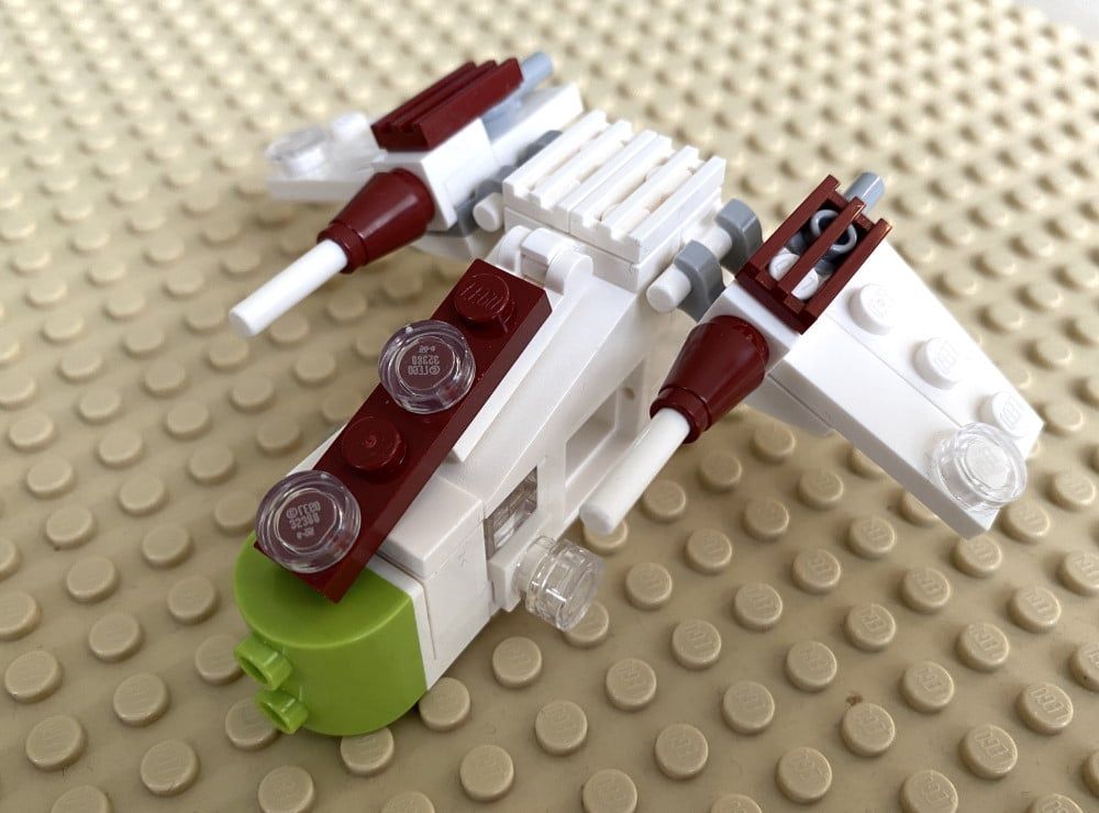 Nach ein paar Minuten habt ihr oder euer Kind das Modell zusammengebaut. Die Bauanleitung ist an einer Stelle etwas verwirrend, da ein Schritt falsch ist, aber das sollte bei so einem kleinen Modell kein Problem sein. Neben meinem 7676 Republic Gunship von 2008, welches schon einige Schlachten geschlagen hat, ist es mit den gleichen Farben super als Mini-Variante erkennbar. Nur die seitlichen Türen sind dem Massstab zum Opfer gefallen. Ein weiterer Unterschied: Das Mini-Modell hat die beiden Laser-Bubbles rechts und links unter dem Cockpit angedeutet, diese Variante gab es bei LEGO in Form der 75021 von 2013 – und natürlich im großen UCS 75309 von 2021.