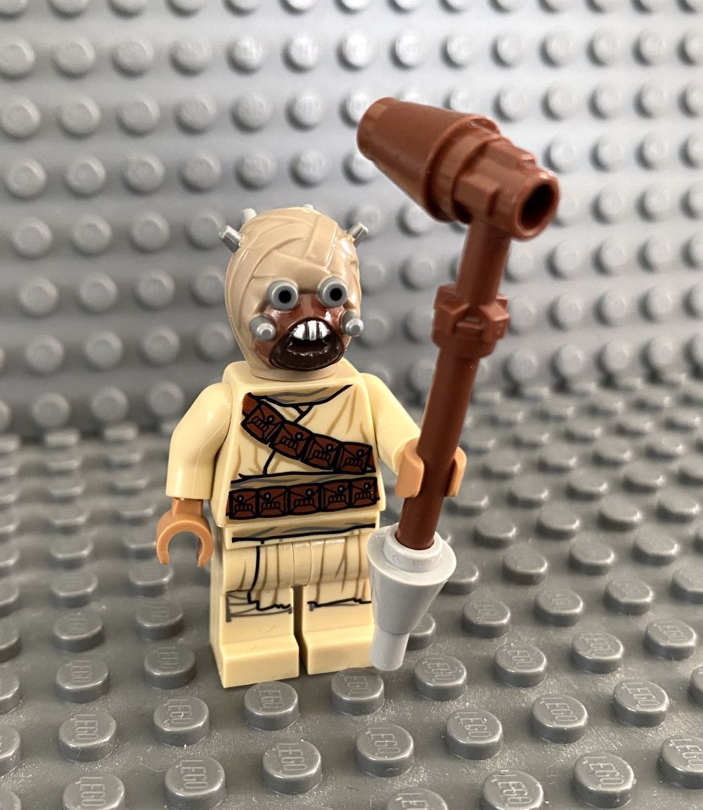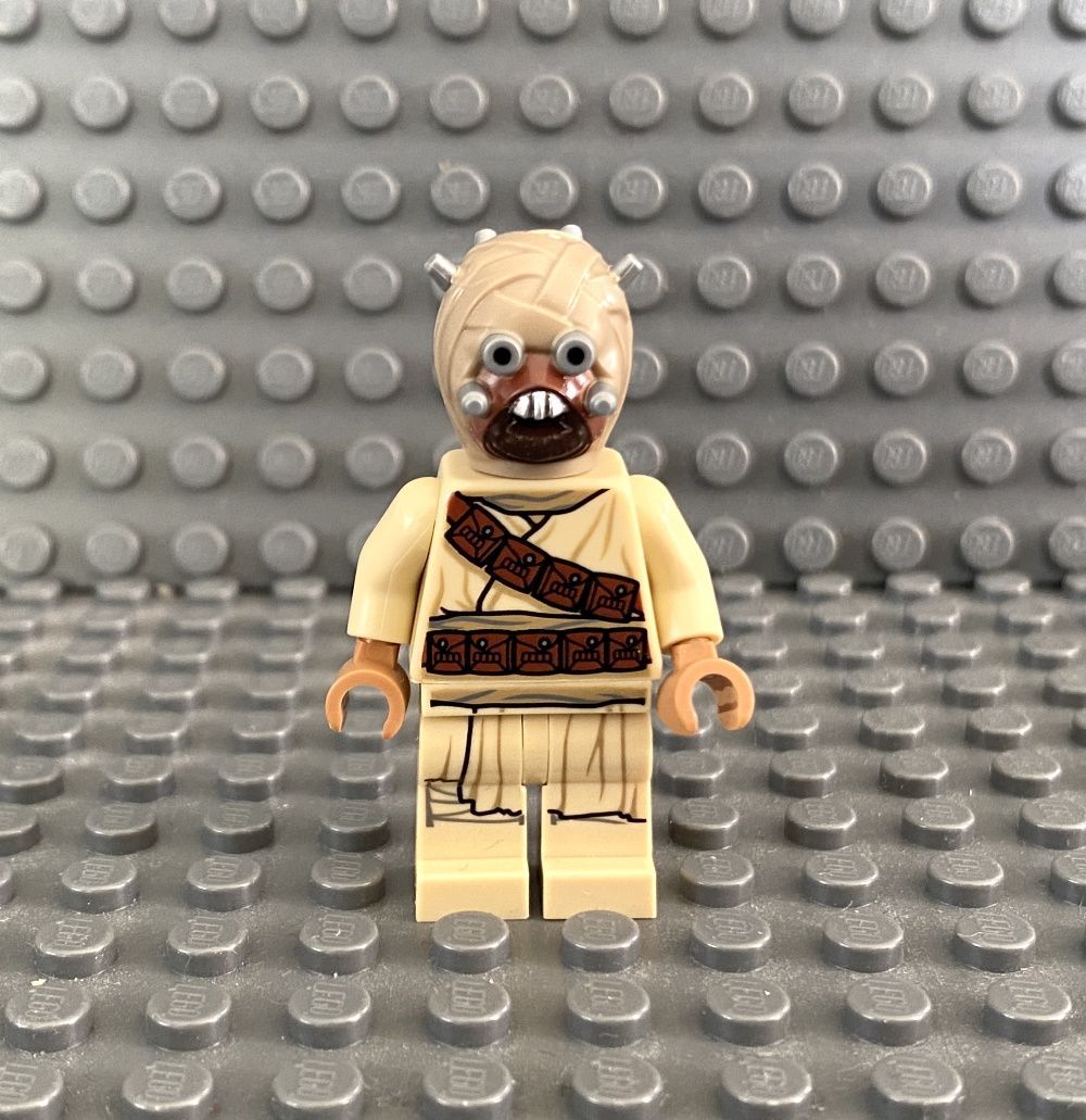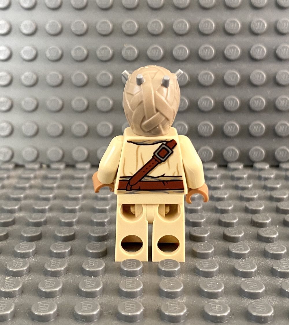 Die Figur selber ist sicher schon bekannt, sie kam bisher neben dem Adventskalender 2021 in drei weiteren Sets vor. Es ist die dritte Variante der Tatooine Ureinwohner und wird seit 2020 verkauft. Sie lag bisher noch der 75270 Obi Wans Hütte, 75265 T-65 Skyhopper vs. Bantha Microfighter und 75299 Trouble on Tatooine bei. Der Unterschied zu der Vorgängerfigur von 2015-2018 ist, dass hier der Brustgurt nur einfach diagonal verläuft und nicht mehr gekreuzt. Die erste Figur dieser Art kam übrigens 2002 im dritten Star Wars Jahr in den Handel und nutzte noch einen normalen Minifiguren-Kopf. Danach war sie 13 Jahre lang nicht mehr im Sortiment, bis in 2015 der oben genannte erste Nachfolger erschien.