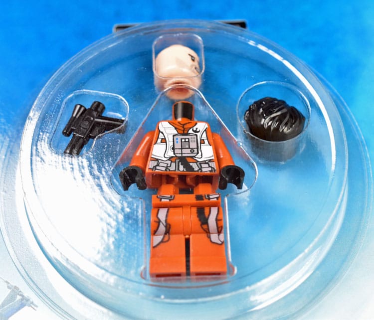 Die Figur selbst besteht aus vier Teilen. Der Torso ist beidseitig bedruckt, die Beine nur auf der Vorderseite. Der Kopf ist mit zwei Gesichtsausdrücken versehen. Statt eines Helms hat der Ameet Verlag dem Piloten nur ein schwarzes Haarteil spendiert. Als Zubehör ist wie bereits erwähnt eine Blaster-Pistole dabei.