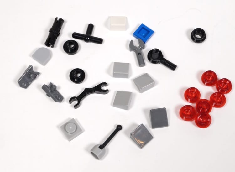 Zu guter Letzt wieder ein Blick auf die Ersatzteile, hier kann wieder einiges in die Bastelkiste wandern. Die roten runden Einser sind wie immer in größerer Zahl dabei, wenn Stud-Shooter verbaut sind.