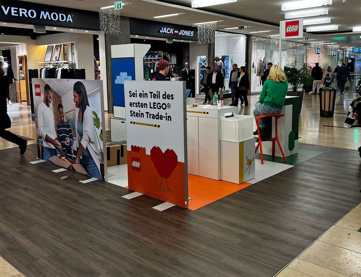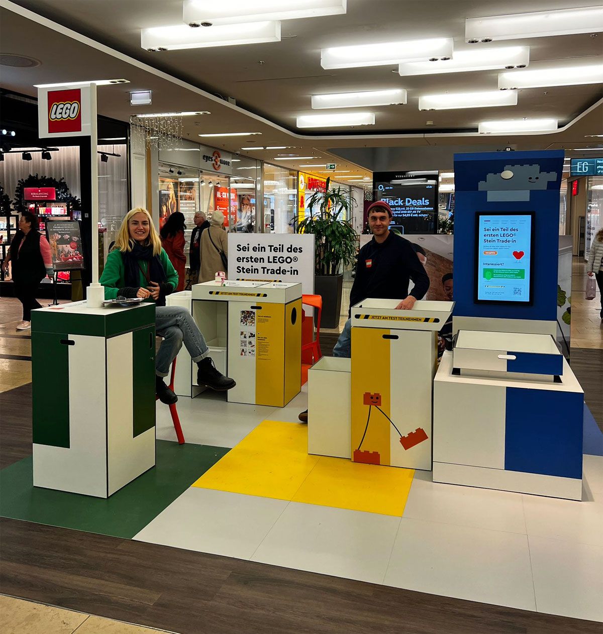 Der Stand war gut am Haupteingang der Arcaden sichtbar. Die beiden vermeintlichen LEGO Mitarbeiter (sie arbeiten eigentlich für eine Marktforschungsgesellschaft) waren sehr sympathisch und haben auch zugestimmt, dass ich Fotos von der LEGO Stein Trade-in Aktion mache.