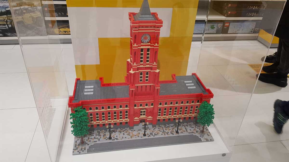 Die Ladeneinrichtung entspricht wie in Bonn oder Dresden dem aktuellen Store-Konzept. Viel Fläche für die ganzen Set-Neuheiten, zahlreiche aufgebaute Modelle, die teils mit einer großen Lupe bestaunt werden können, und einem überschaubaren Personalisierungs-Studio (das ist die neue Pick-a-Brick-Wand). Welche Steine und Teile zur Eröffnung in der Wand sind, seht ihr auf einem der Bilder unten. Eyecatcher im Mall of Berlin Store ist ein großes LEGO Display-Modell vom Roten Rathaus.