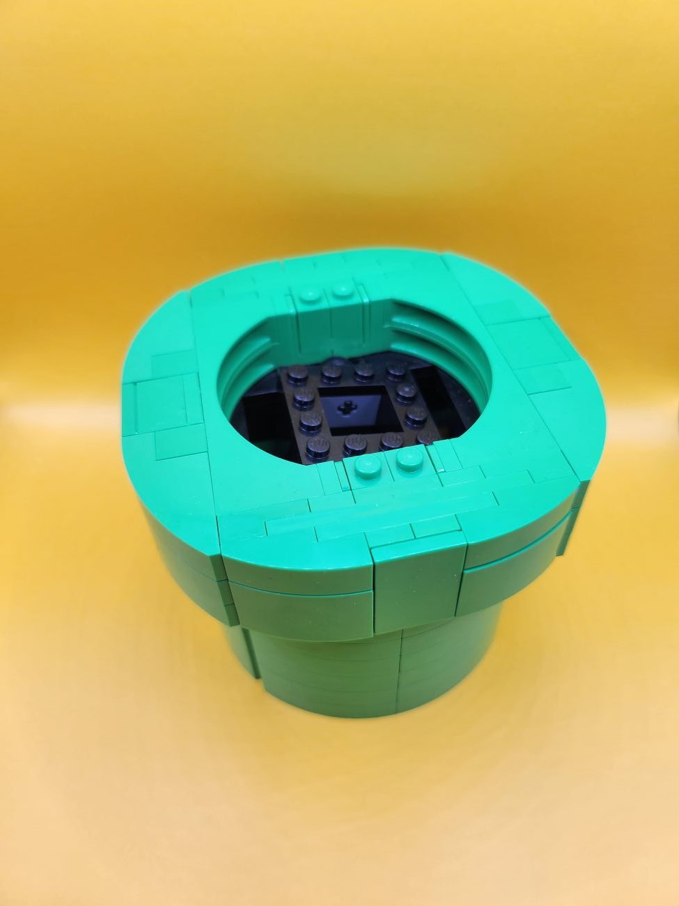 Die Röhre wird im Anschluss mit zahlreichen Fliesen ummantelt, ebenfalls wird ein Mechanismus für eine Art „Falltür“ sichtbar, dazu später aber mehr. Bereits jetzt hält die stabile Röhre was sie verspricht und passt wunderbar zum etwas gröberen Super Mario Pixel-Look. Der Stiel wird mit Hilfe von zahlreichen Plates gebaut und zwei Kugelgelenke sorgen dafür, dass die Blätter befestigt werden können.