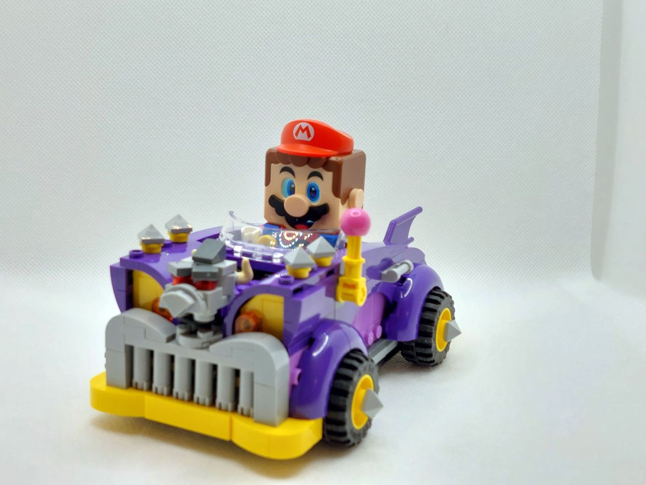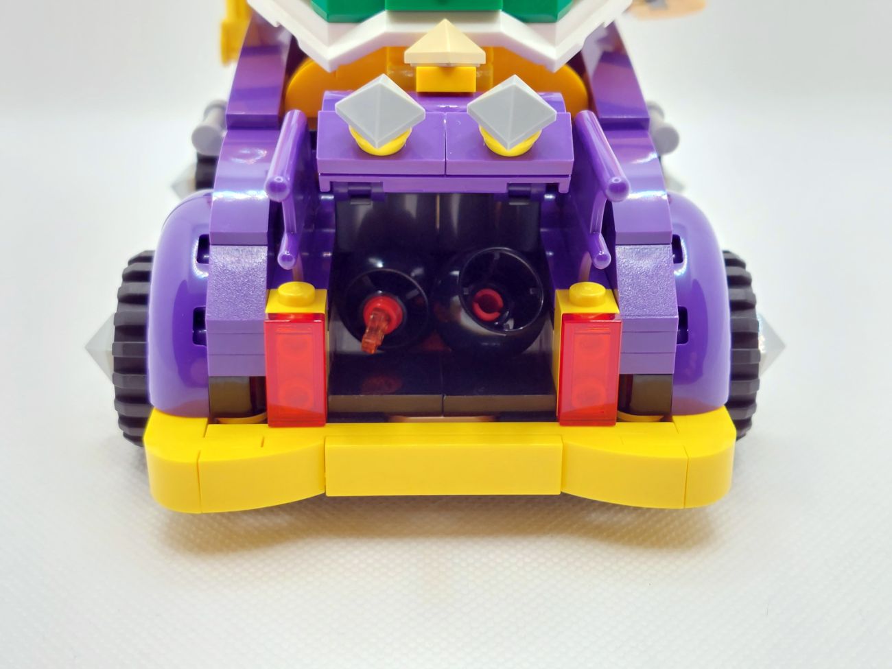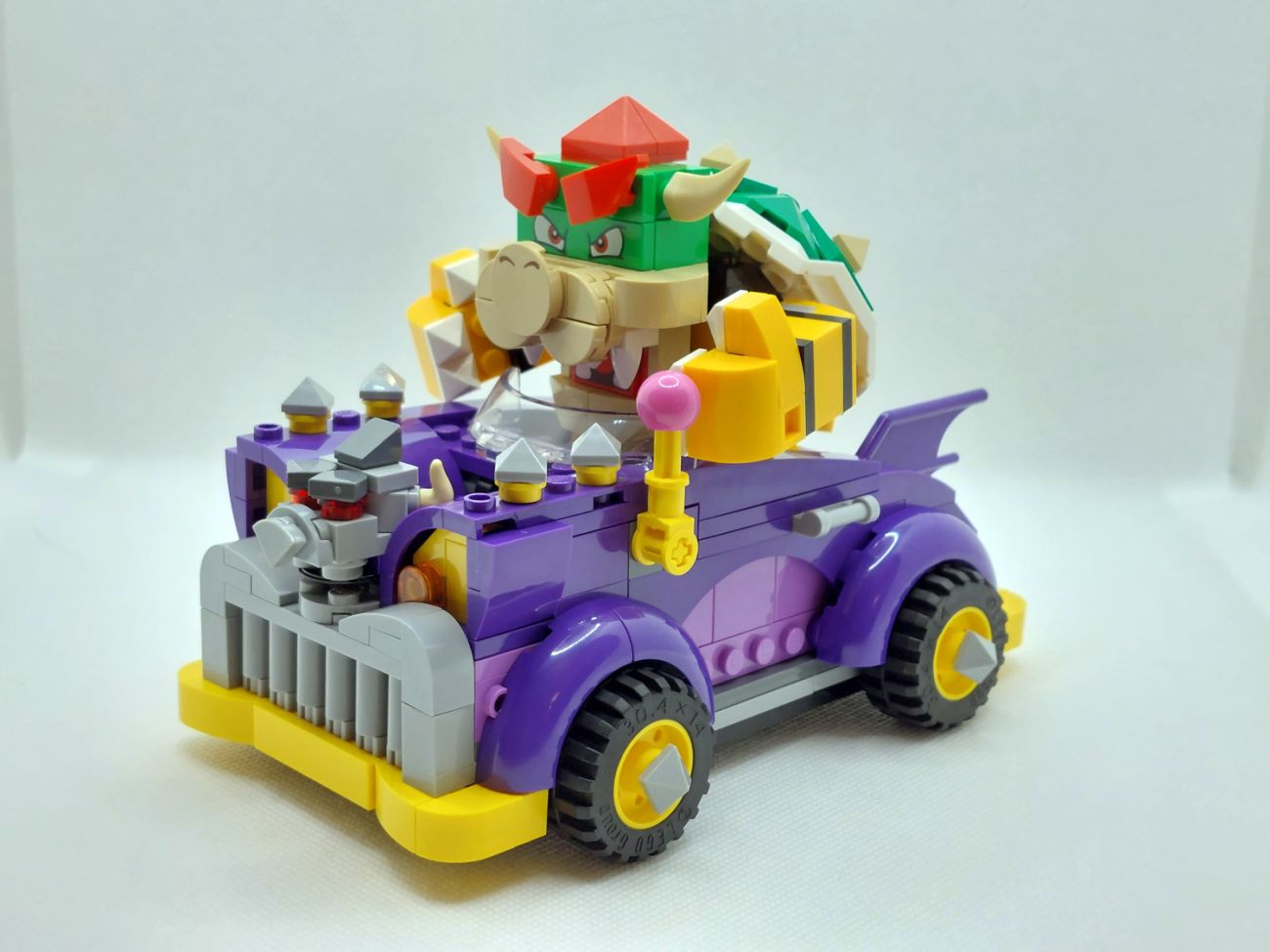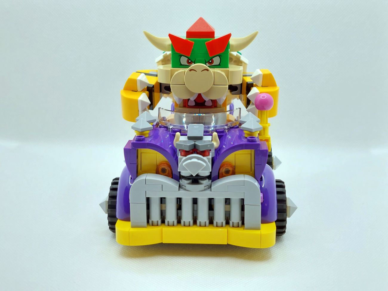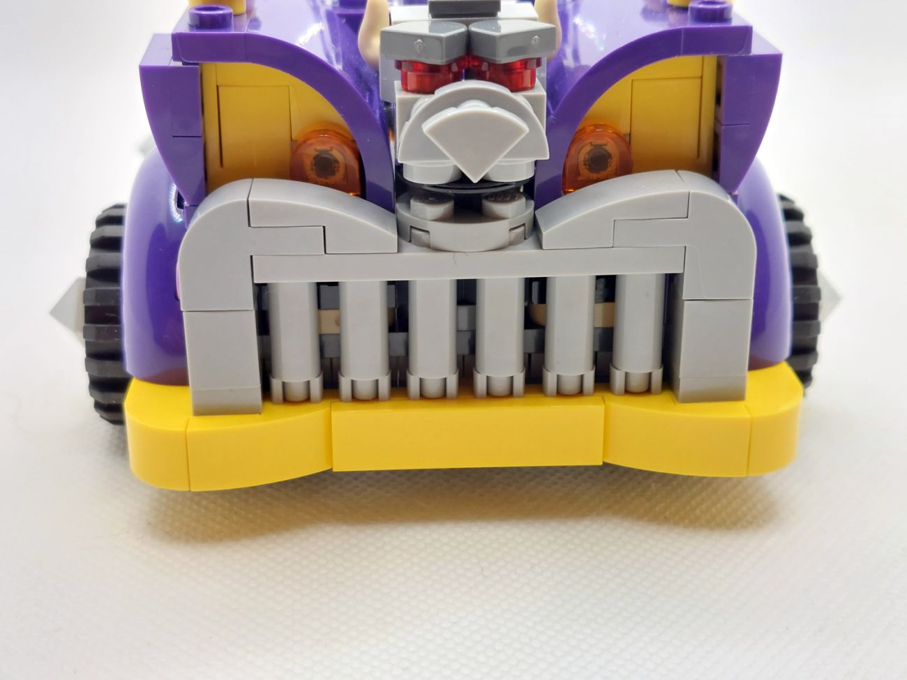 Durch den Hebel an der Seite kann der Minibowserkopf an der Motorhaube auf und ab bewegt werden; öffnet man den Kofferraum, fallen durch die Bewegung des Hebels zusätzlich zwei kleine Bomben heraus, denen man im Spiel ausweichen muss. Besonders gefallen mir die grauen Kerzen, die vorne als Kühlergrill verwendet werden, und die curved slopes für Bowsers Augenbrauen.