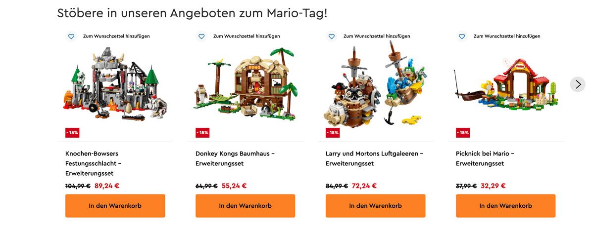 Am 10. März 2024 ist der internationale Super Mario Day. Und LEGO feiert als Franchise-Nehmer natürlich kräftig mit. Im LEGO Online-Shop sind bereits einige LEGO Super Mario Sets mit 15 Prozent Rabatt reduziert. Zudem gibt es im Zeitraum vom 04. bis 11. März 20224 für alle LEGO Super Mario Einkäufe doppelte LEGO Insiders Punkte.