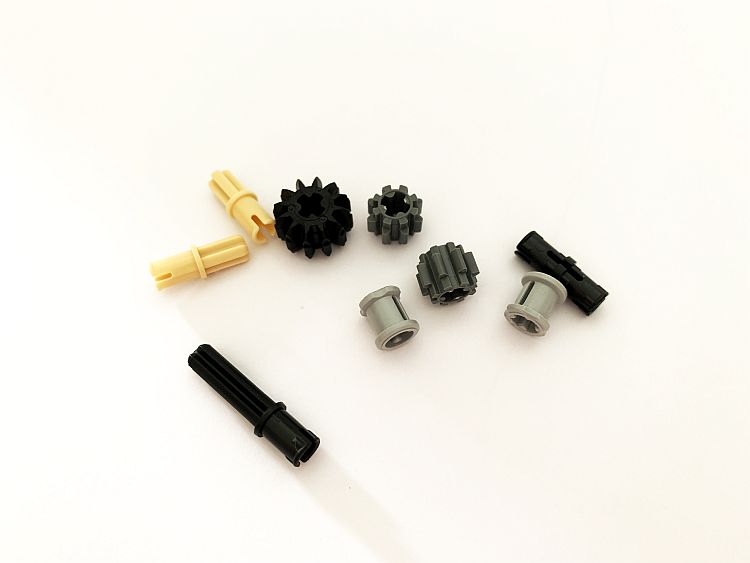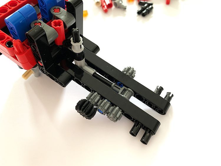 Die Vorrichtung für die Mulde ist auch schnell zusammengesteckt und wird über das größere schwarze Zahnrad später auf und ab bewegt.